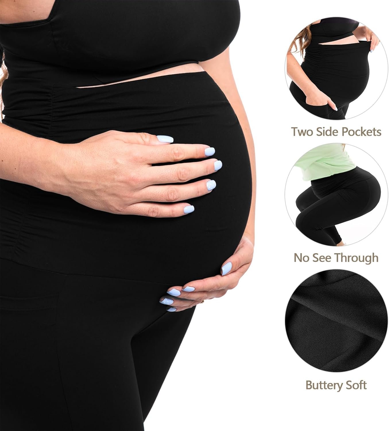 Customers find these maternity leggings comfortable and well-fitting, noting they’re not tight on the belly and true to regular pre-pregnancy size. The material thickness receives positive feedback, with one customer mentioning it’s thick enough to not be see-through, while the stretchiness provides good support for the belly area. Customers appreciate the pockets and consider them among the best maternity leggings available, offering great value for the price. Opinions about transparency are mixed, with some customers saying they’re not see-through while others find them very see-through.