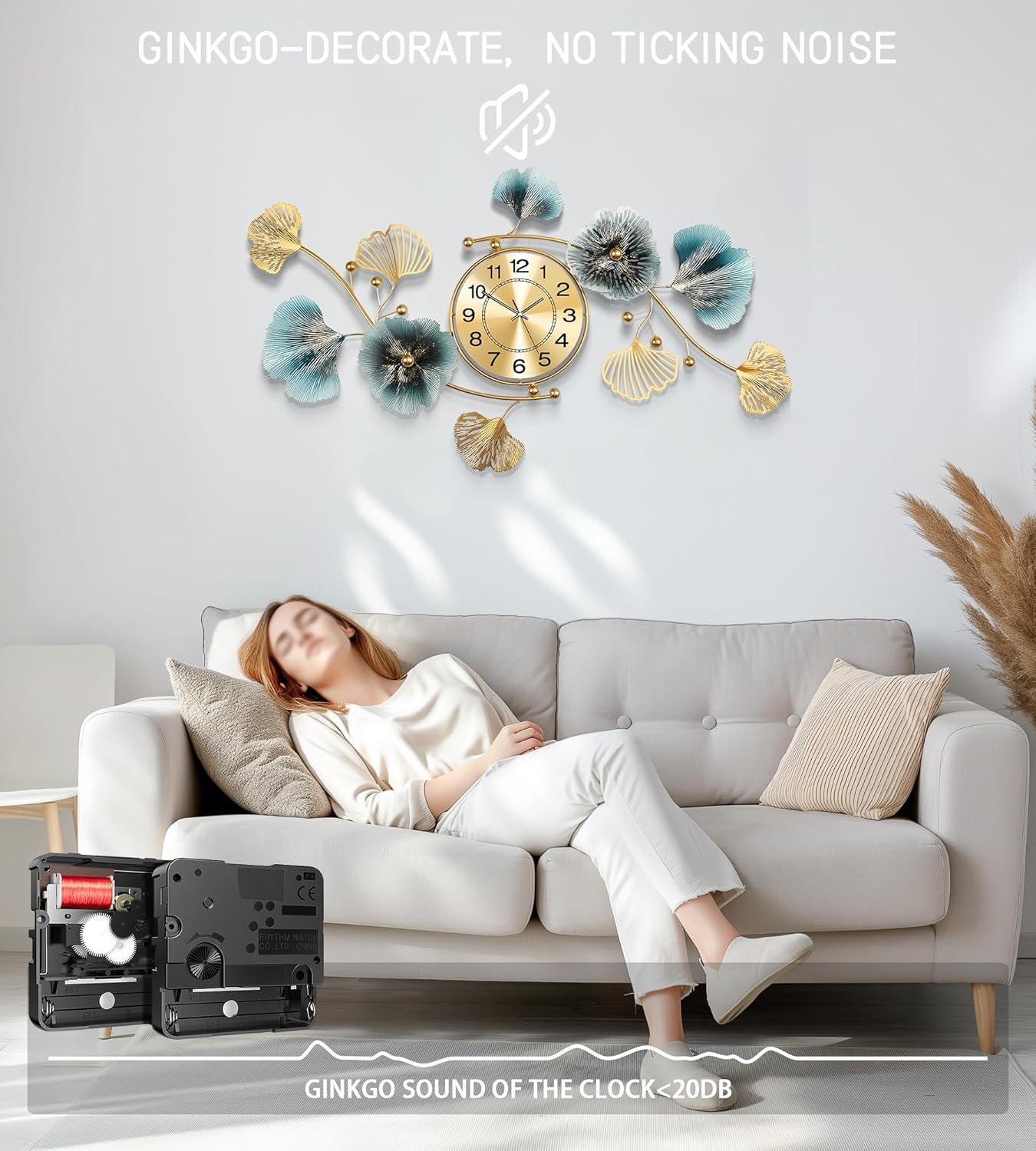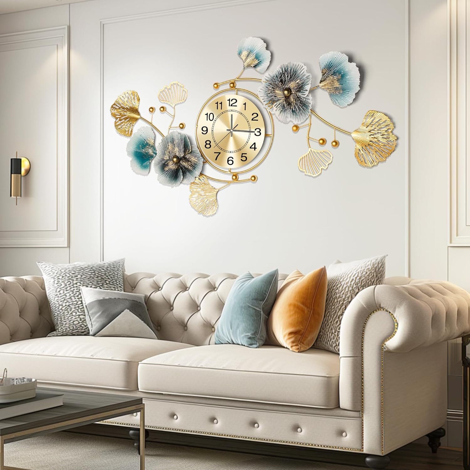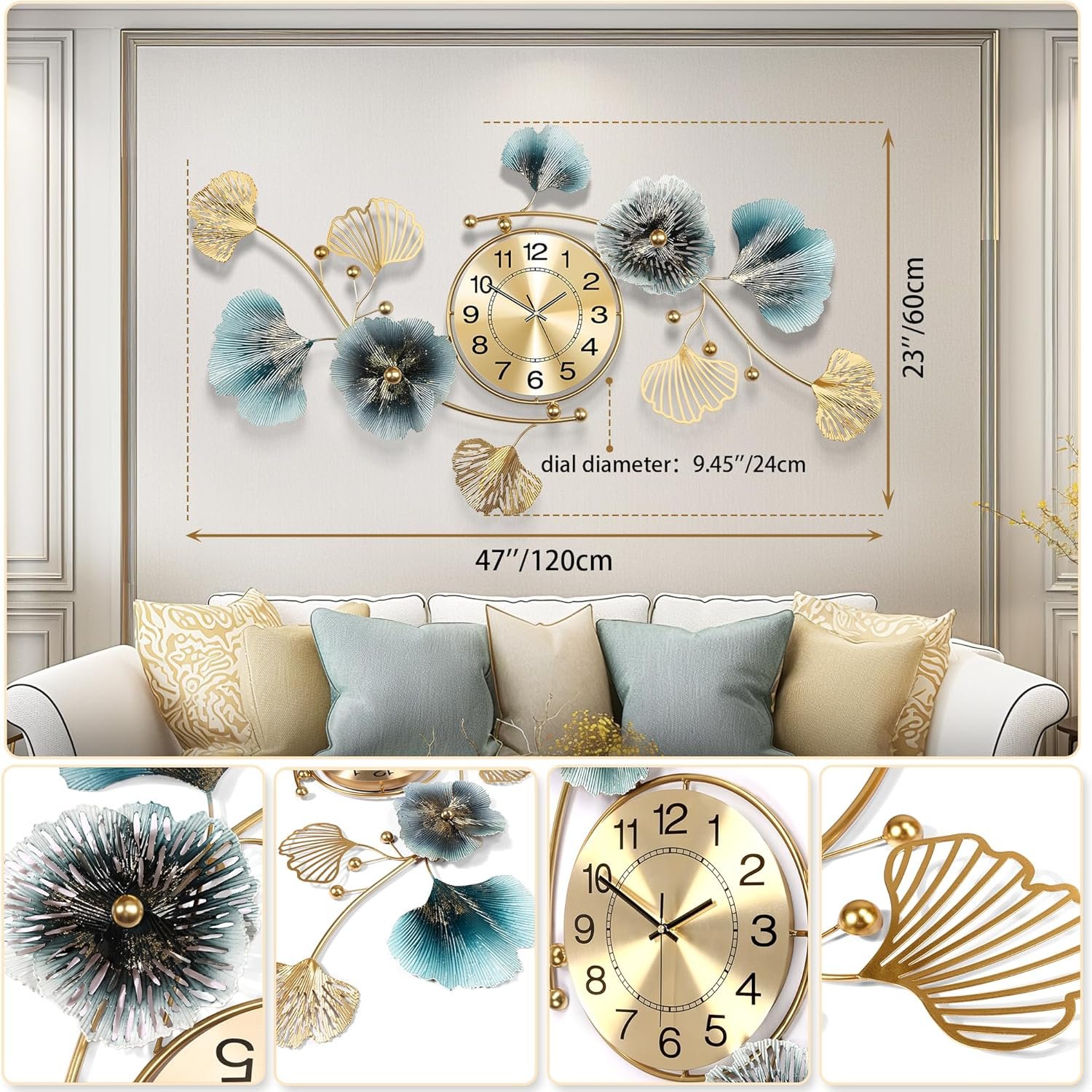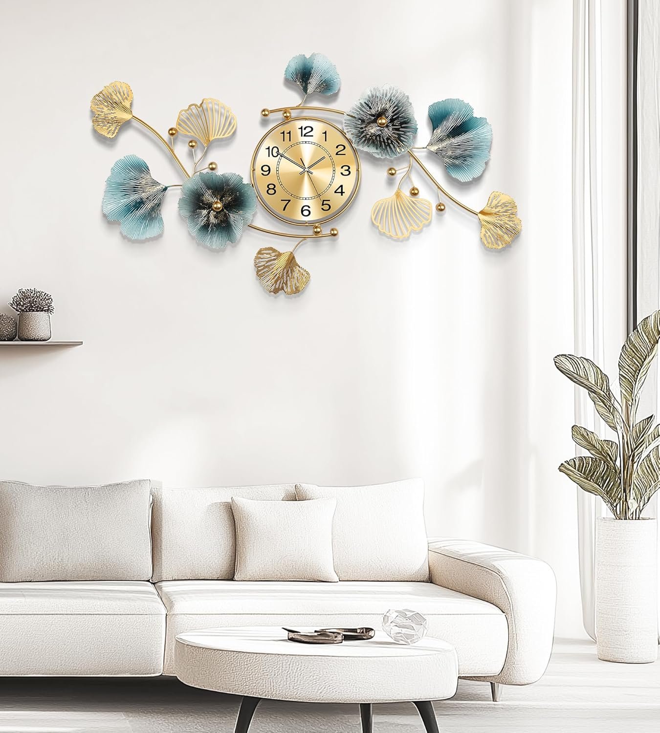Wall Clocks for Living Room Decor,Large Wall Clock,3D Creative Metal Ginkgo Leaf Design,with Silent Movement Wall Clocks for Home Wall Decor Clock(47″x23″)