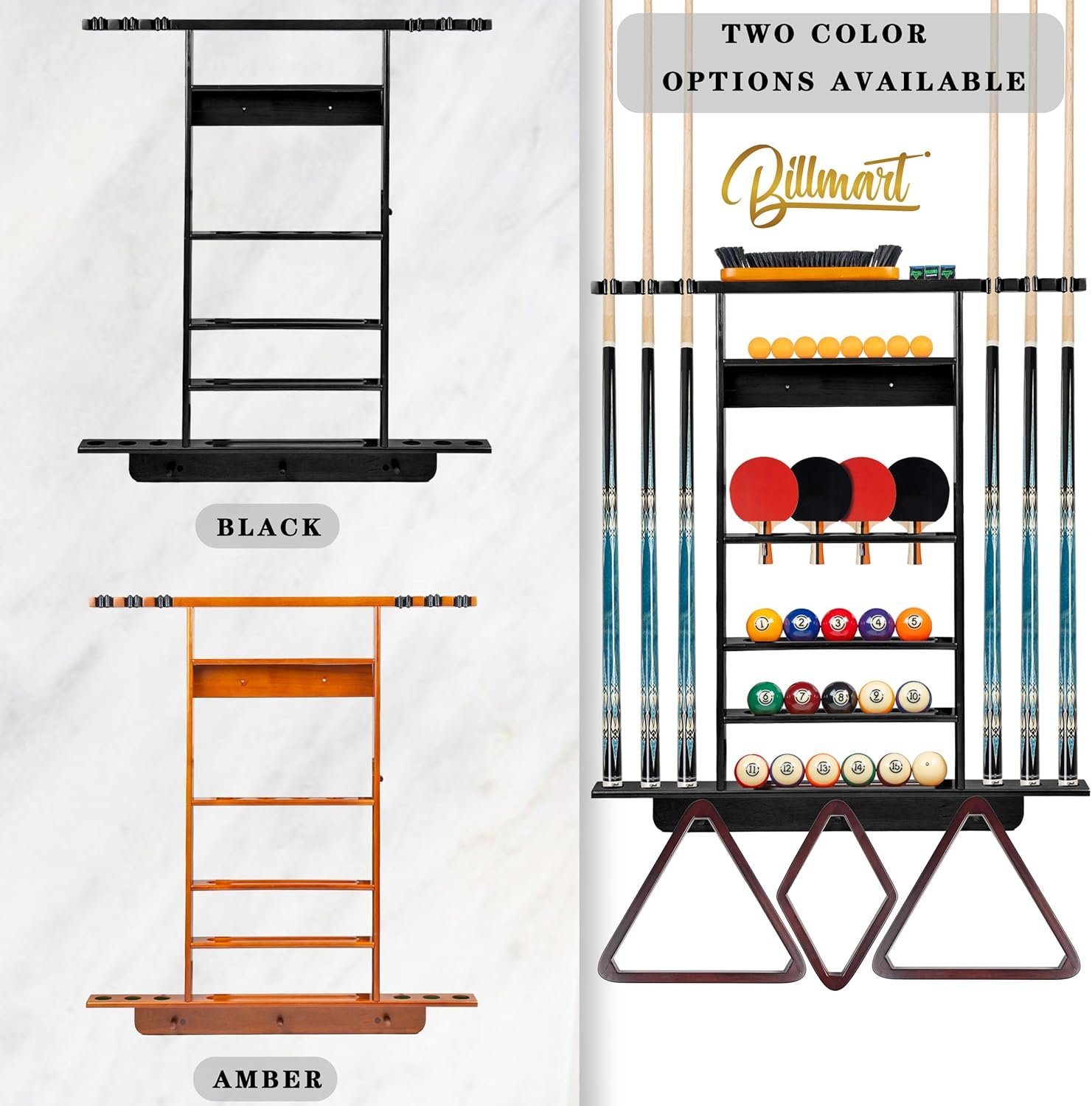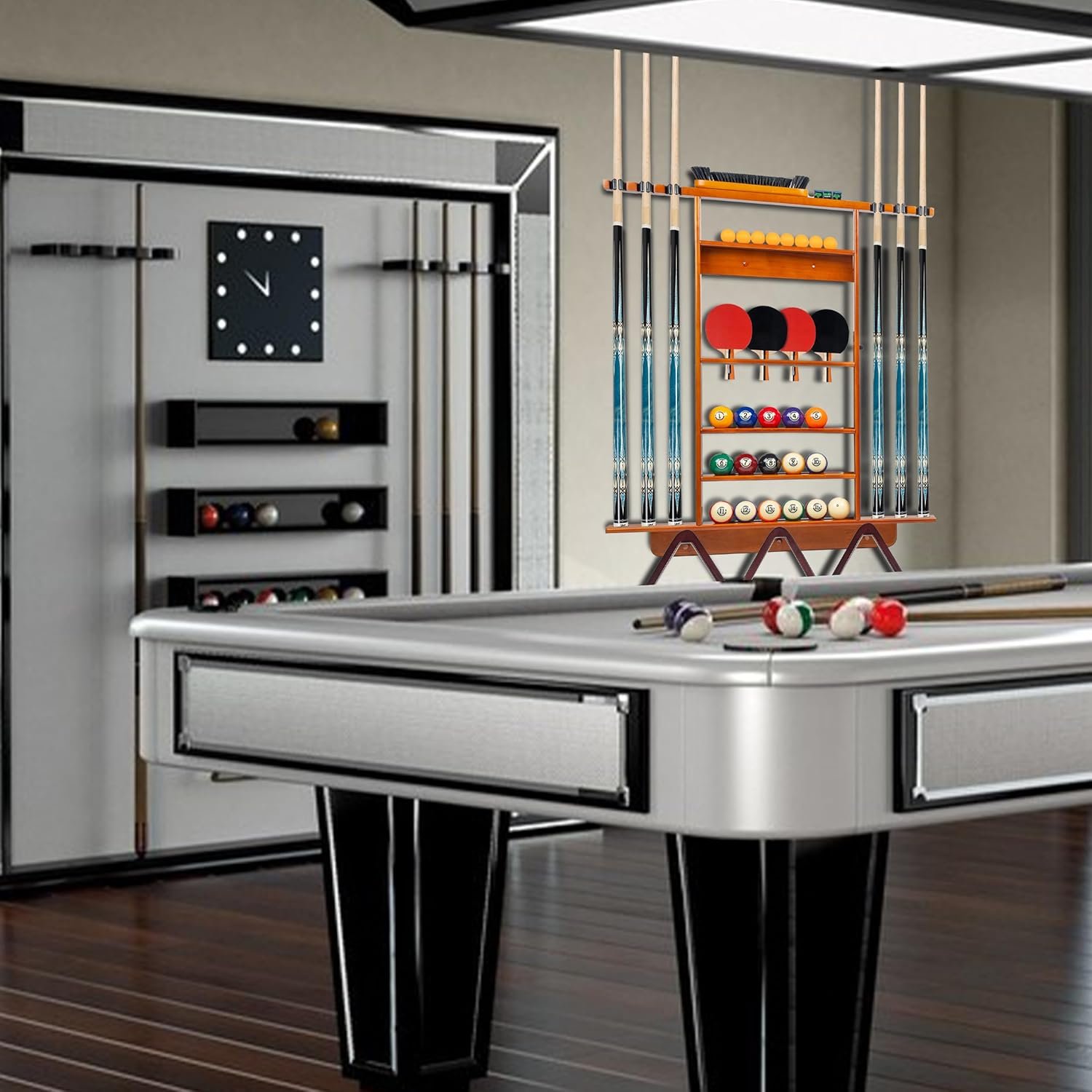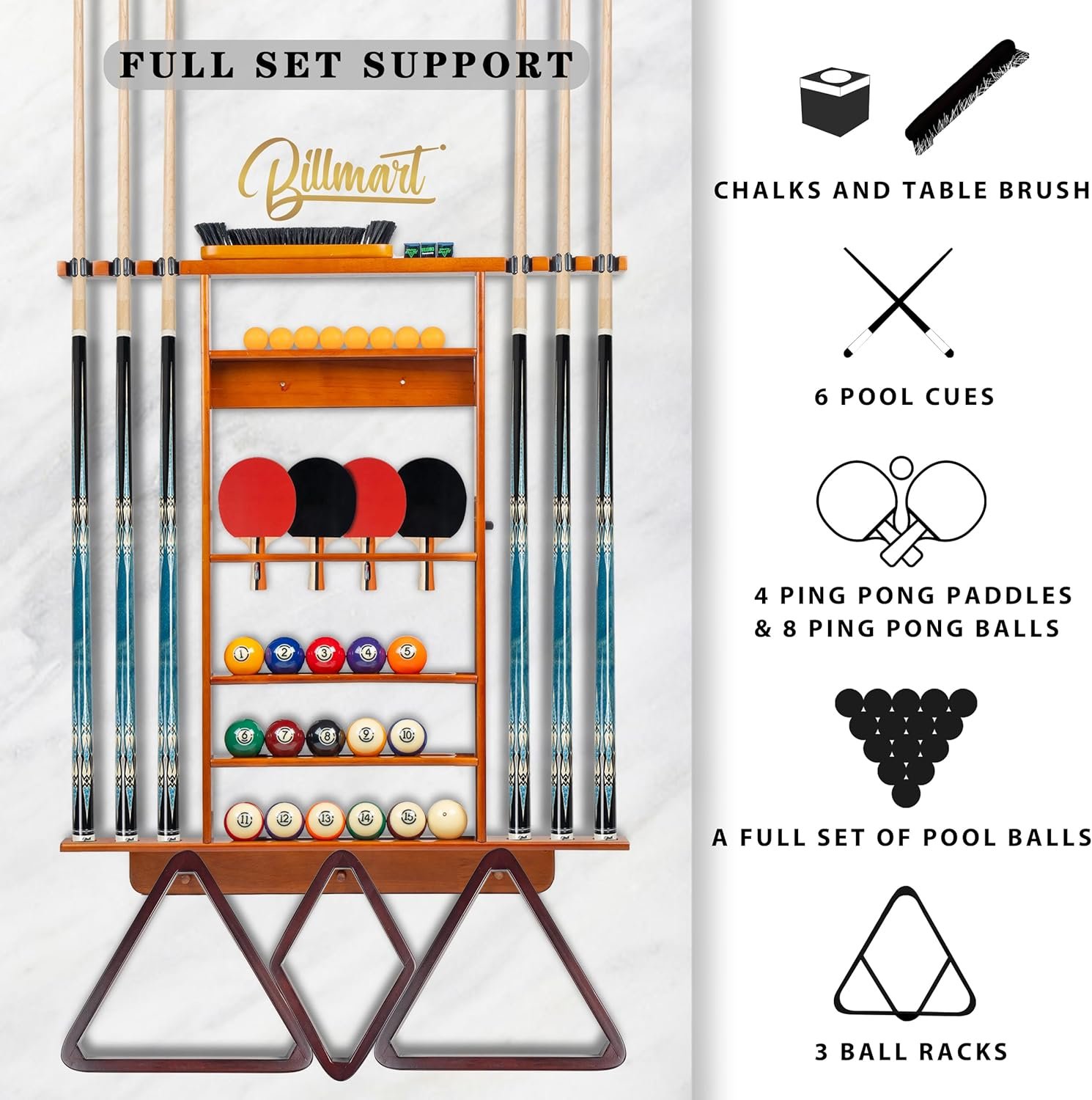 All-in-One Storage Solution: This 2-in-1 solid wood rack is designed to accommodate 6 cue sticks, 16 billiard balls, 4 ping pong paddles, 8 ping pong balls, 3 triangle or diamond-shaped billiard racks, chalk, and a brush, providing an all-encompassing storage solution for your game room.