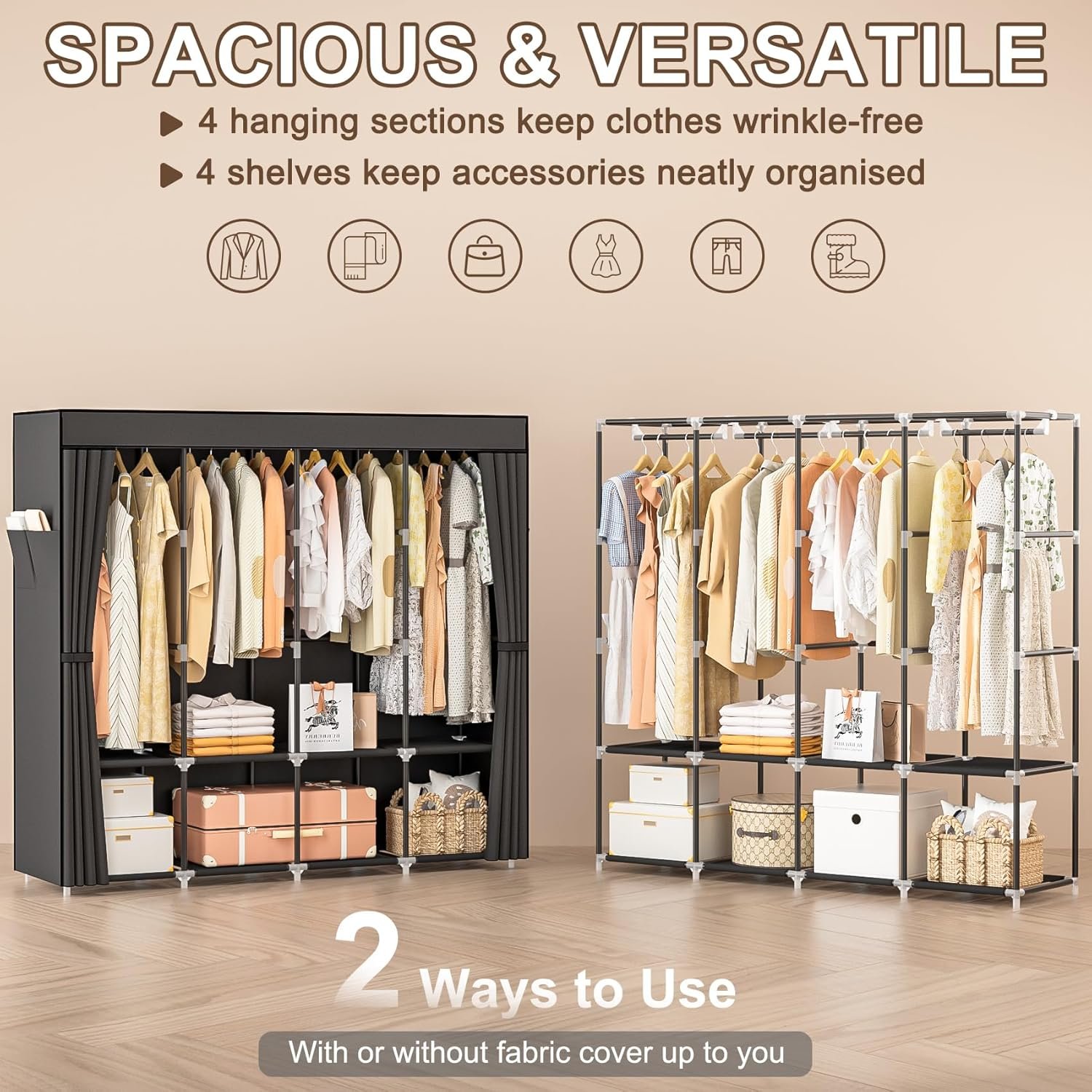 Wardrobe Closet, 66 Inch Portable Closet for Hanging Clothes, Large Capacity Clothes Rack Organizer with Cover & 4 Hanging Rods & 8 Storage Shelves & 2 Side Pockets (Black)