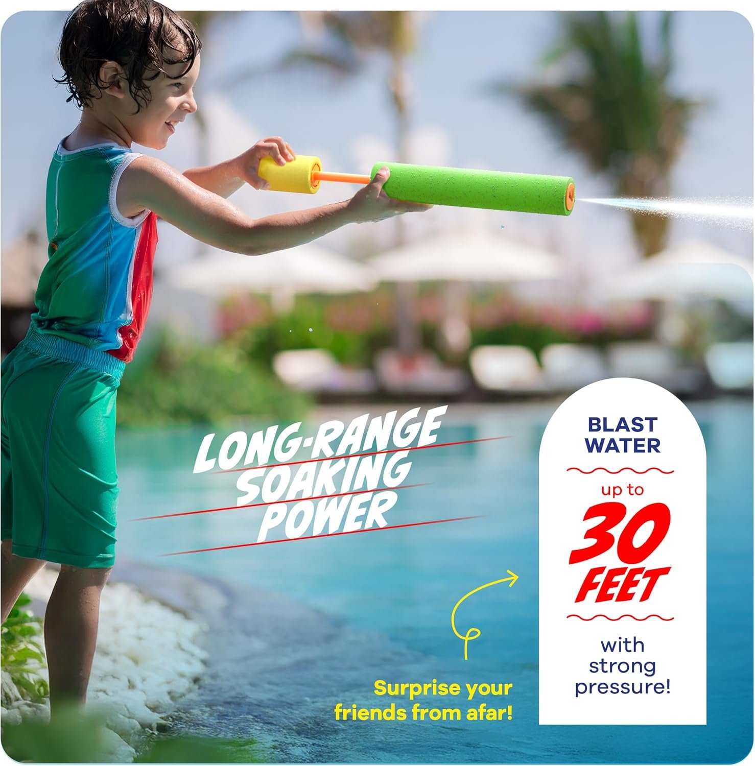 30 FEET OF SPLASH: Dip it, aim it, Blast! These blasters shoot powerful pressure super far — perfect to surprise your friends from afar and win the water fight with a big splash!