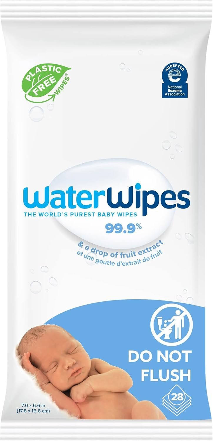 WaterWipes Plastic-Free Original Baby Wipes, 99.9% Water Based Wipes, Unscented & Hypoallergenic for Sensitive Skin, 28 Count (Pack of 1), Packaging May Vary