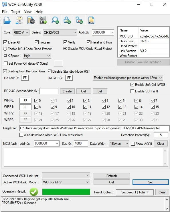 Mais après avoir lu les instructions, j’ai téléchargé WCH-LinkUtility, sélectionné le mode WCH-LinkRV là-bas, et tout fonctionne parfaitement. Au fait, j’ai mis à jour le firmware et les pilotes du programmateur là-bas.