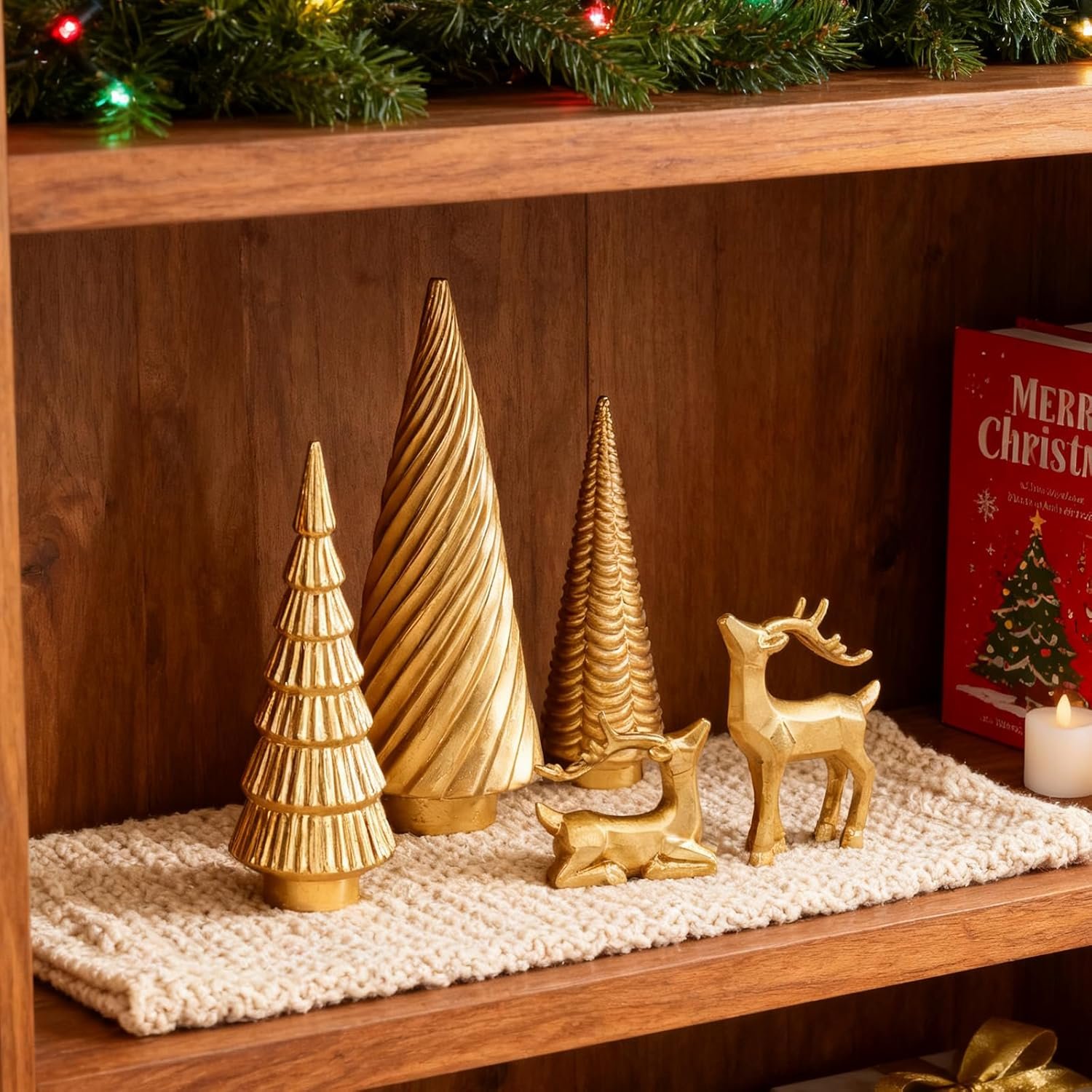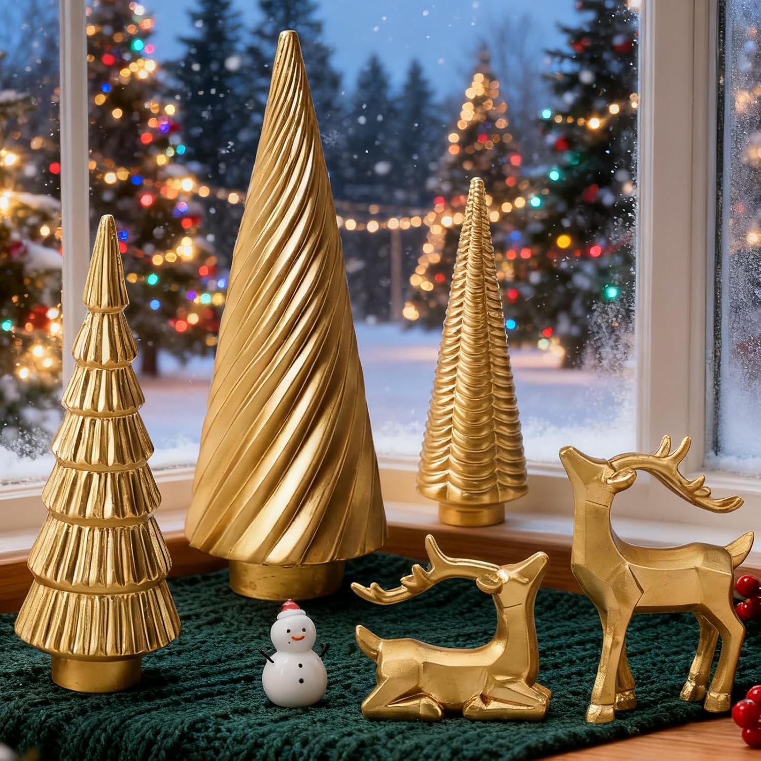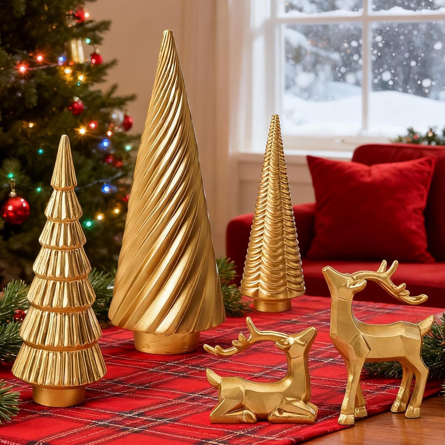 【Durable Resin】 Each Christmas deer figurine and tree is crafted from durable resin, ensuring these collectible figurines maintain their shimmering gold finish and bring timeless Christmas decor indoor year after year