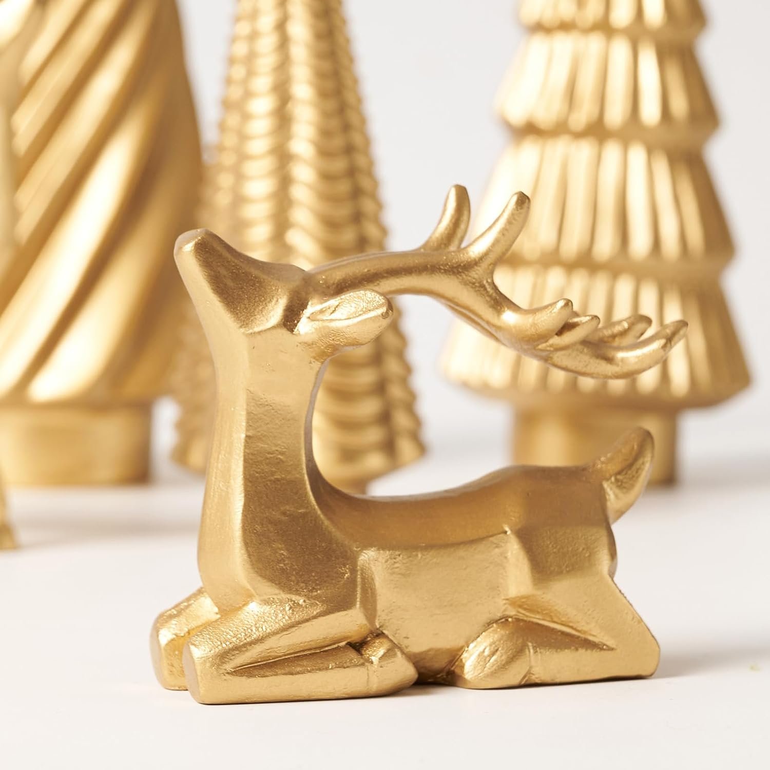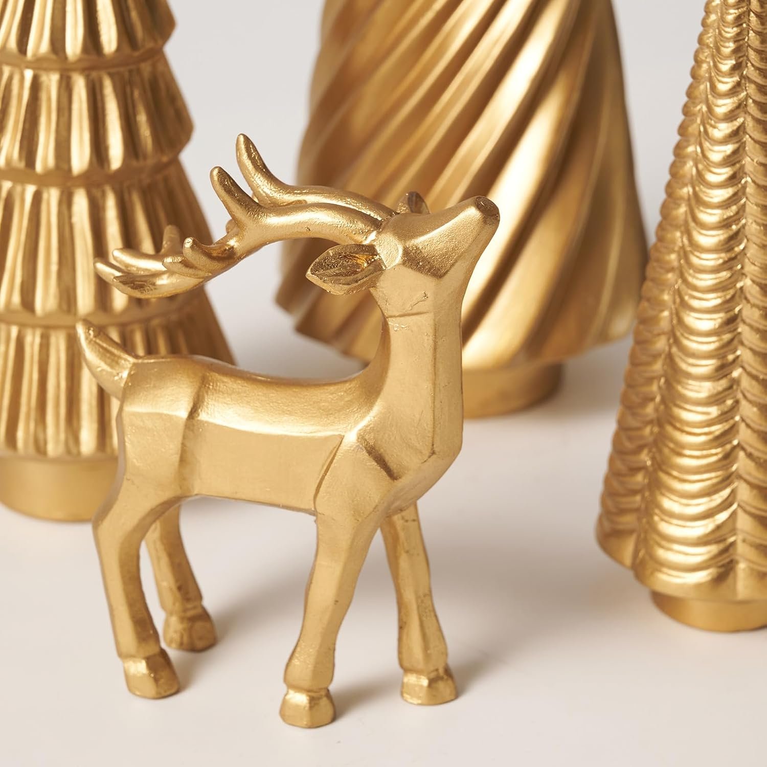 【Elegant Set of 5】 This 5-piece Christmas decoration includes 2 gold reindeer statues (3.14”x4.00” and 2.75”x2.55”) and 3 Christmas trees (3.54”x9.00”, 2.75”x7.48”, and 2.00”x5.51”), each featuring a different surface texture