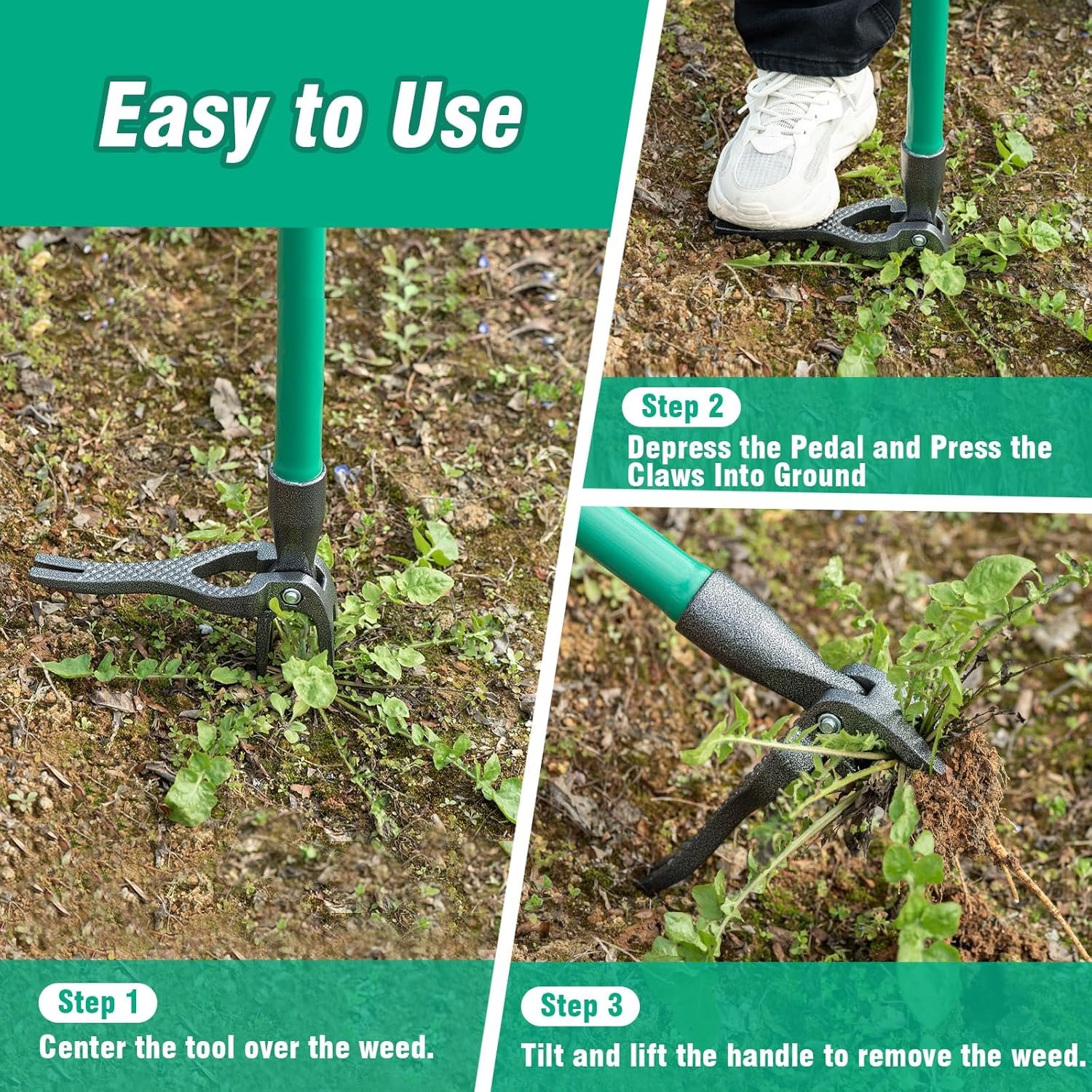 Simple 3-Step Weeding Process: Step 1: Position the weeder directly over the weed. Step 2: Apply force with your foot and press the claw into the center of the weed to lift into the ground. Step 3: Gently tilt the weeder toward the lever side. The lever is used to close the claw and pull the weed out of the ground to deal with the weed