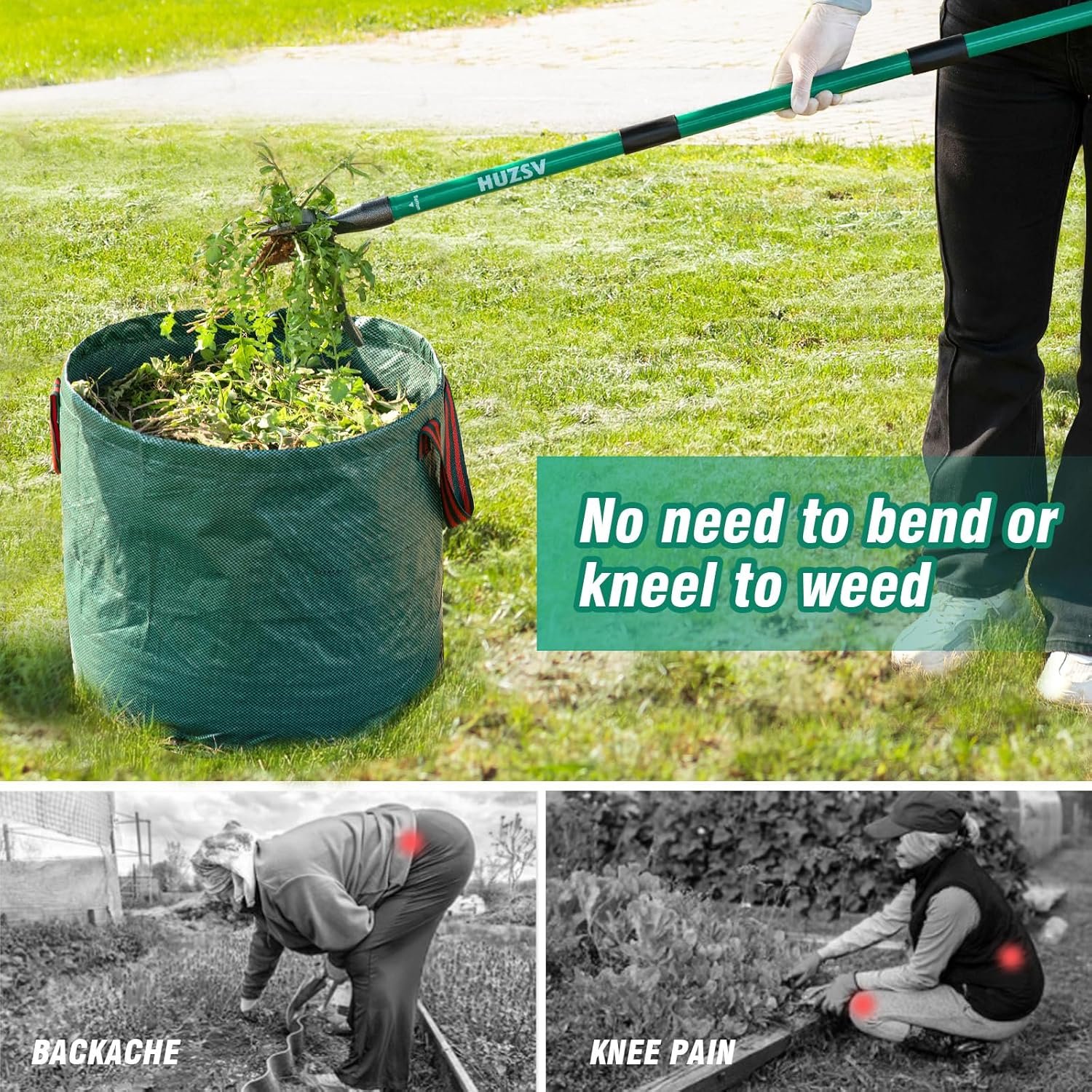 Stand Up Weeding Tool:Assembled with 3 Metal handle,HUZSV weeder stand up weed puller is is optimized for ergonomic use.The adjustable handle length from 32-48 inch accommodates different heights and work requirements,effortlessly pull weeds from your garden without having to bend down or kneel