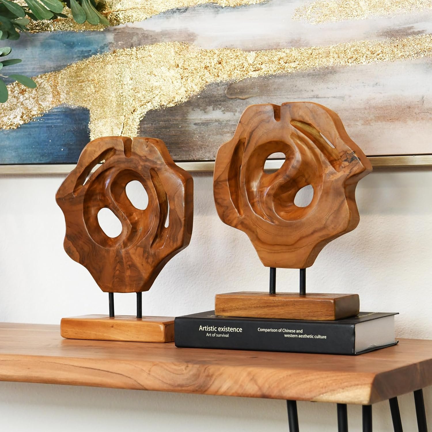 WELLAND Set of 2 Teak Abstract Handmade Sculpture Live Edge Home Decor Statue,9″x3.5″x12.25