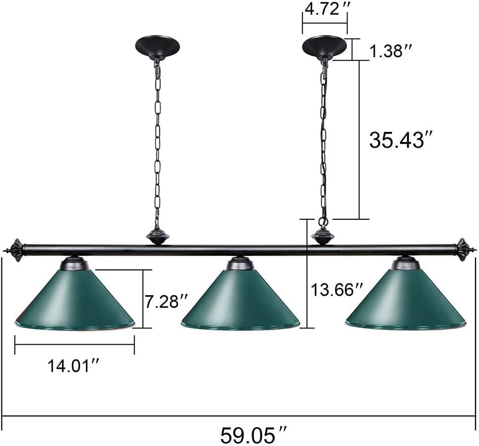 Billiard Light Dimension: Fixture size of L59.05 inch× W14.17 inch × H13.62 inch; Chain length of 35.4 inch (Adjustable), Lamp shade size of D14.01 inch × H7.3 inch, suitable for 7ft. 8ft. 9ft pool table