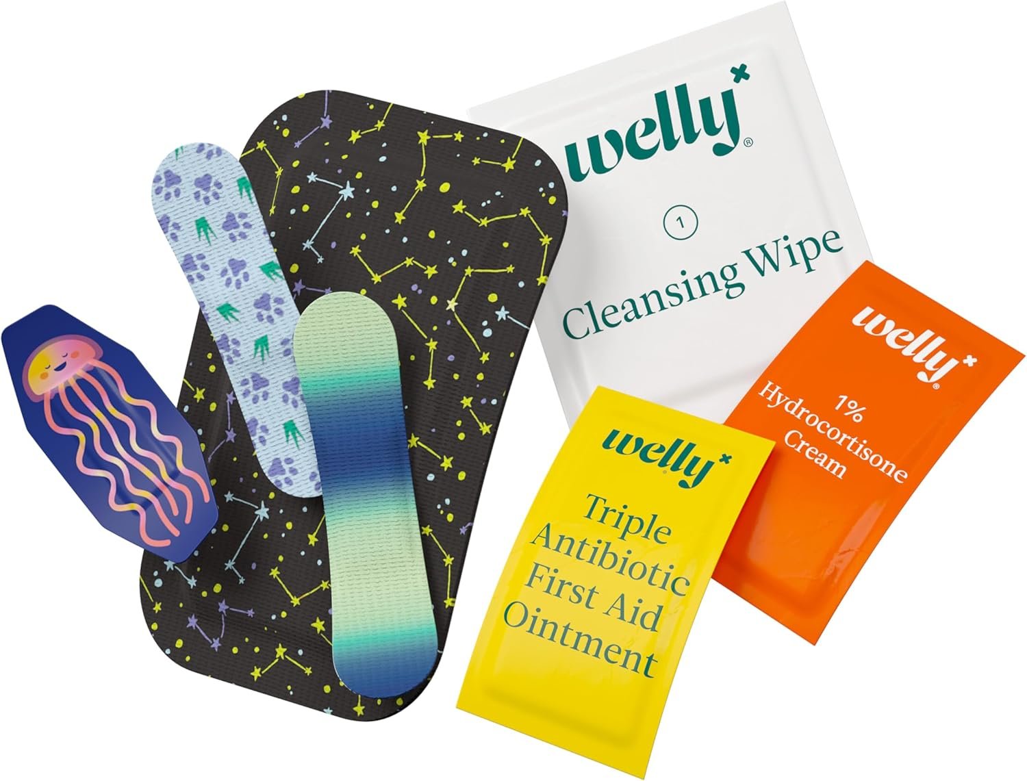 Welly First Aid Kit – Adhesive Bandages in Flexible Fabric and Waterproof, Singe Use Ointments (Triple Antibiotic, Cleansing Wipes and Hydrocortisone) – 70 Count