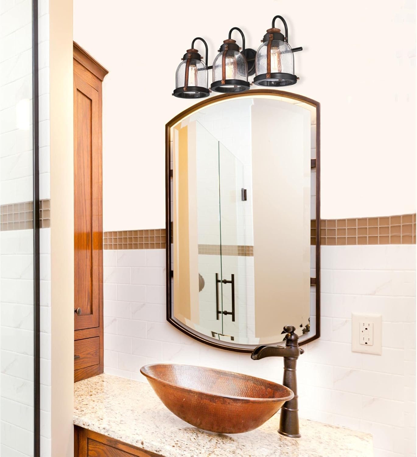 Vintage-style three-light wall fixture with oil-rubbed bronze finish and barnwood accents adds charming style