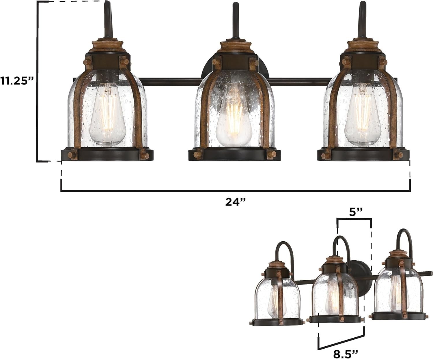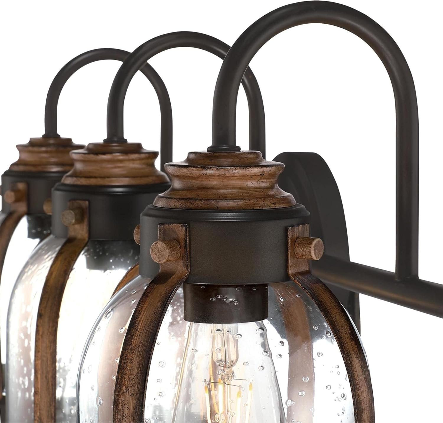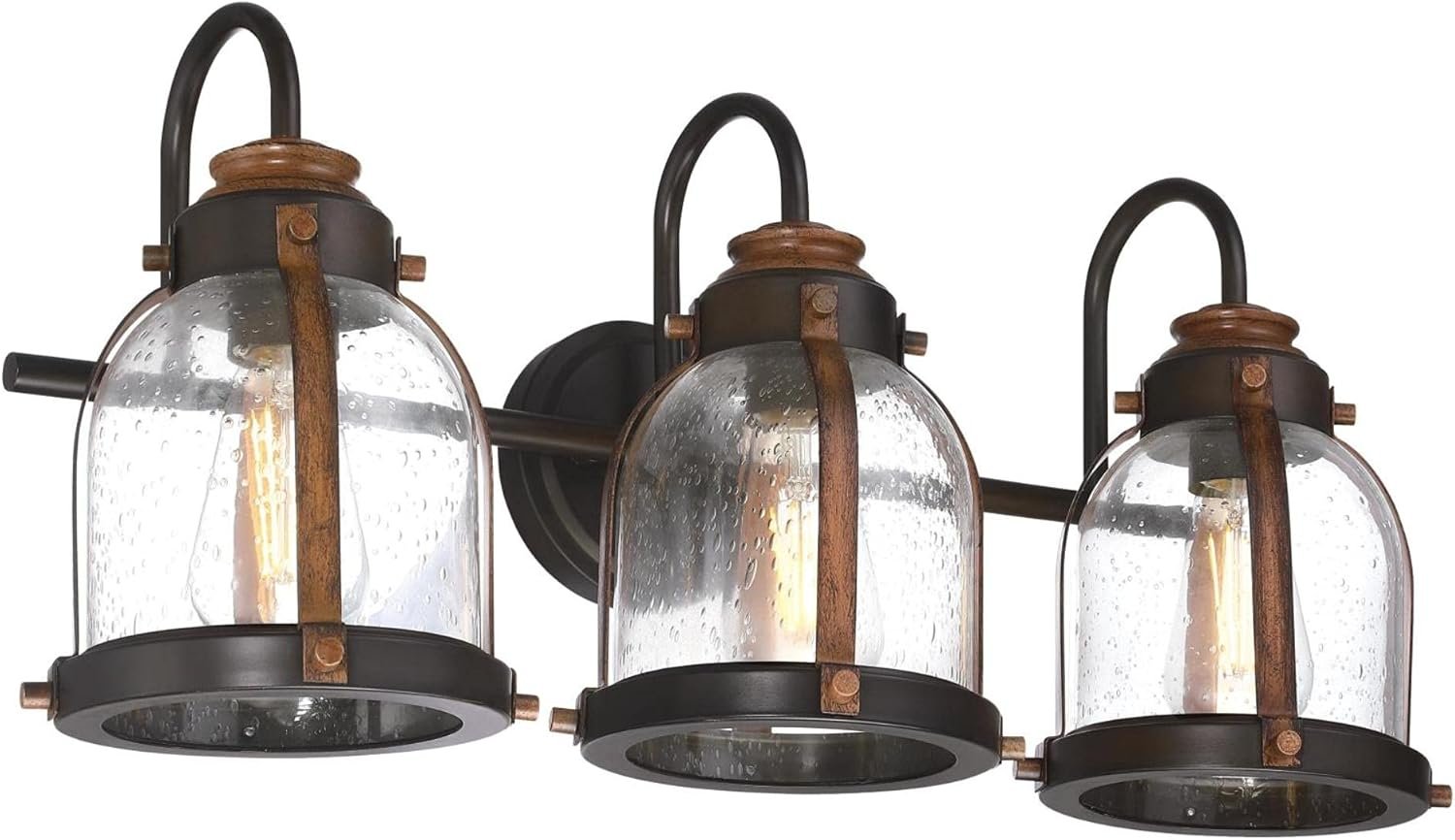 Add charm to indoor spaces with this Westinghouse Cindy three-light vanity fixture. The two-tone oil-rubbed bronze and barnwood finish, with hand-blown clear seeded glass, adds a warm touch to vintage and farmhouse-style interiors. Attention-grabbing style in the bathroom, powder room, or entryway, this fixture provides lovely illumination. Install above a mirror for bright task lighting. Westinghouse is a trusted, global brand. Westinghouse knows lighting and offers products with exceptional quality, reliability, and functionality. Product reference number 61182.