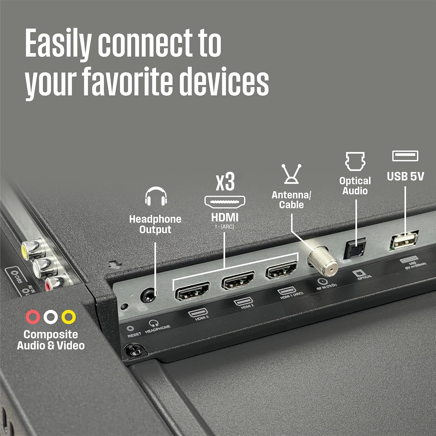 Connectivity is King – Packed with 3 x HDMI, 1 x Composite Video, 1 x Optical Digital Audio inputs for maximum flexibility. A full array of inputs to connect your cable box, game console, streaming stick, sound bar, DVD/Blu-ray player or a digital antenna for local channels.