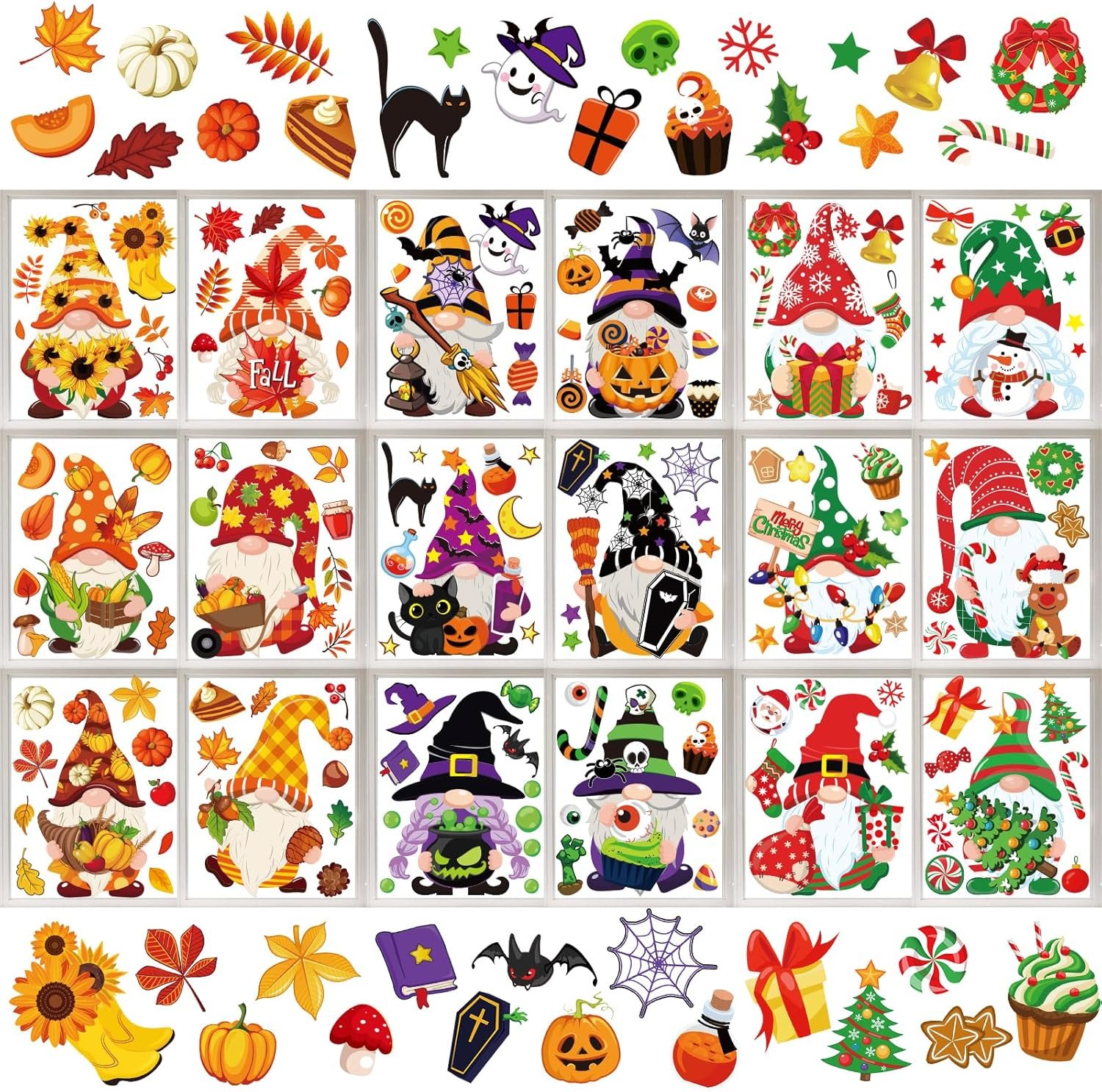 Whaline 204Pcs Fall Christmas Halloween Gnome Window Clings Colorful Cute Gnomes Pumpkins Bat Xmas Tree Window Decals Double-Sided Window Stickers for Autumn Thanksgiving Home Classroom Decor