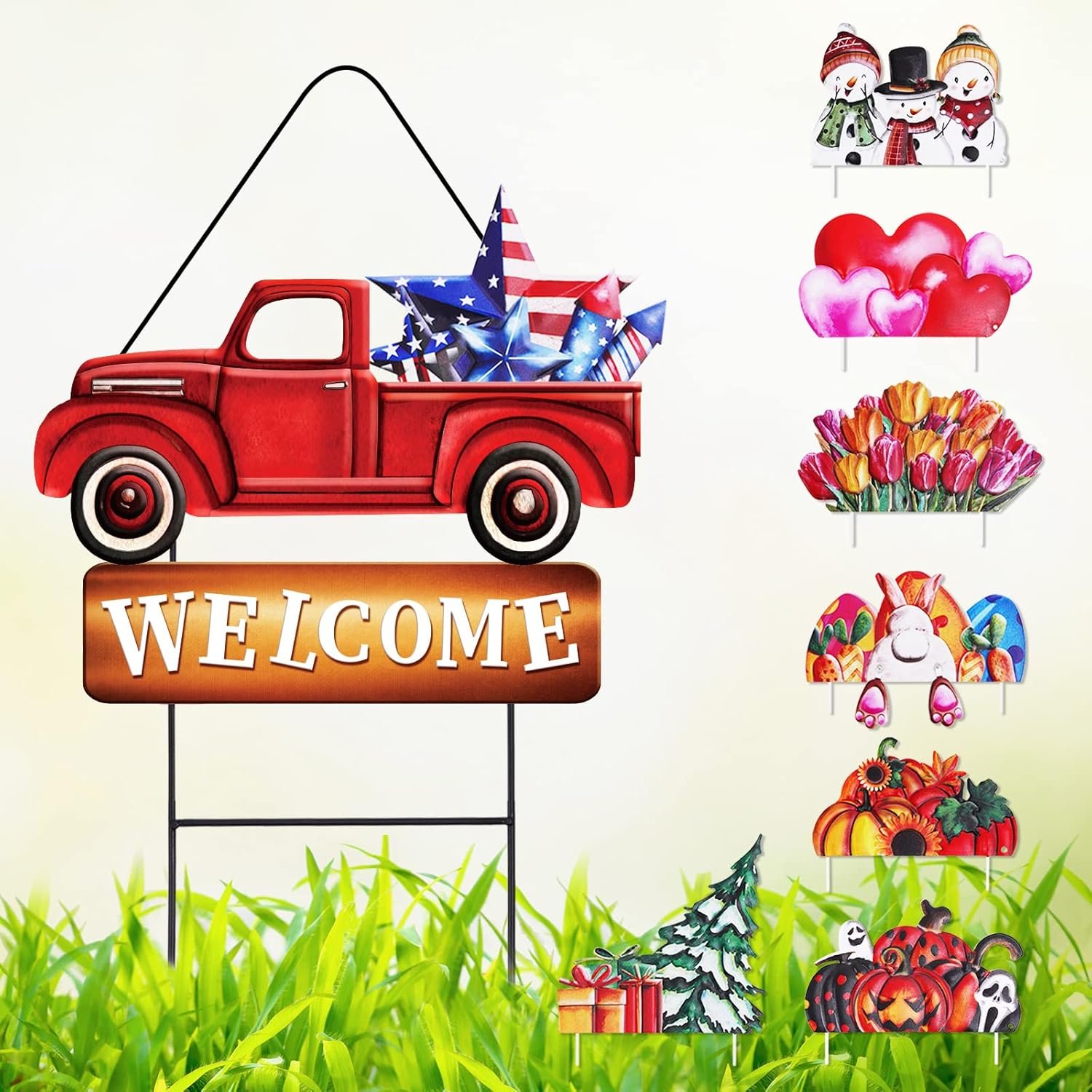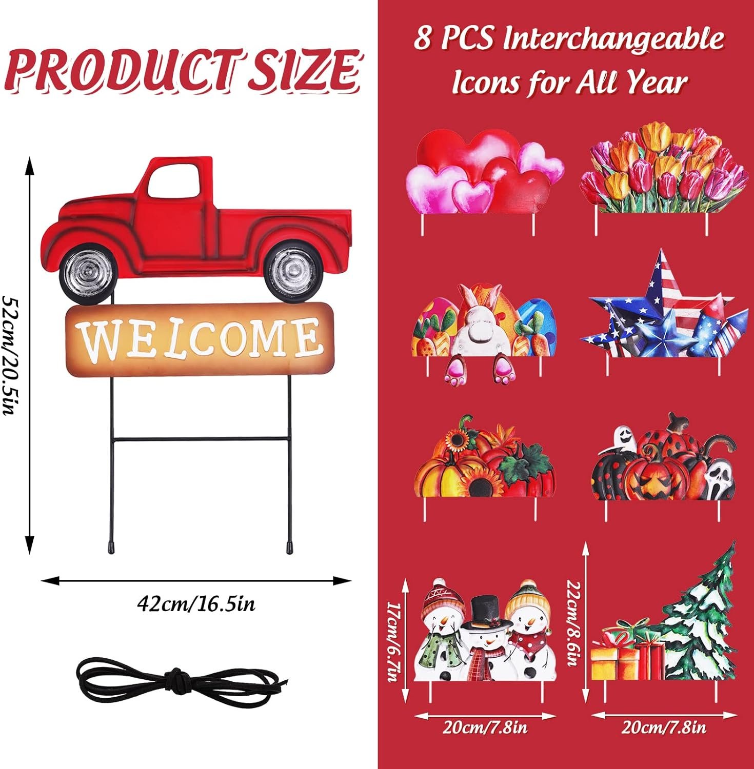Classic red truck pattern and other 8 seasonal and holiday elements, interchangeable design make the garden stake unique and adorable, suitable for a whole year.