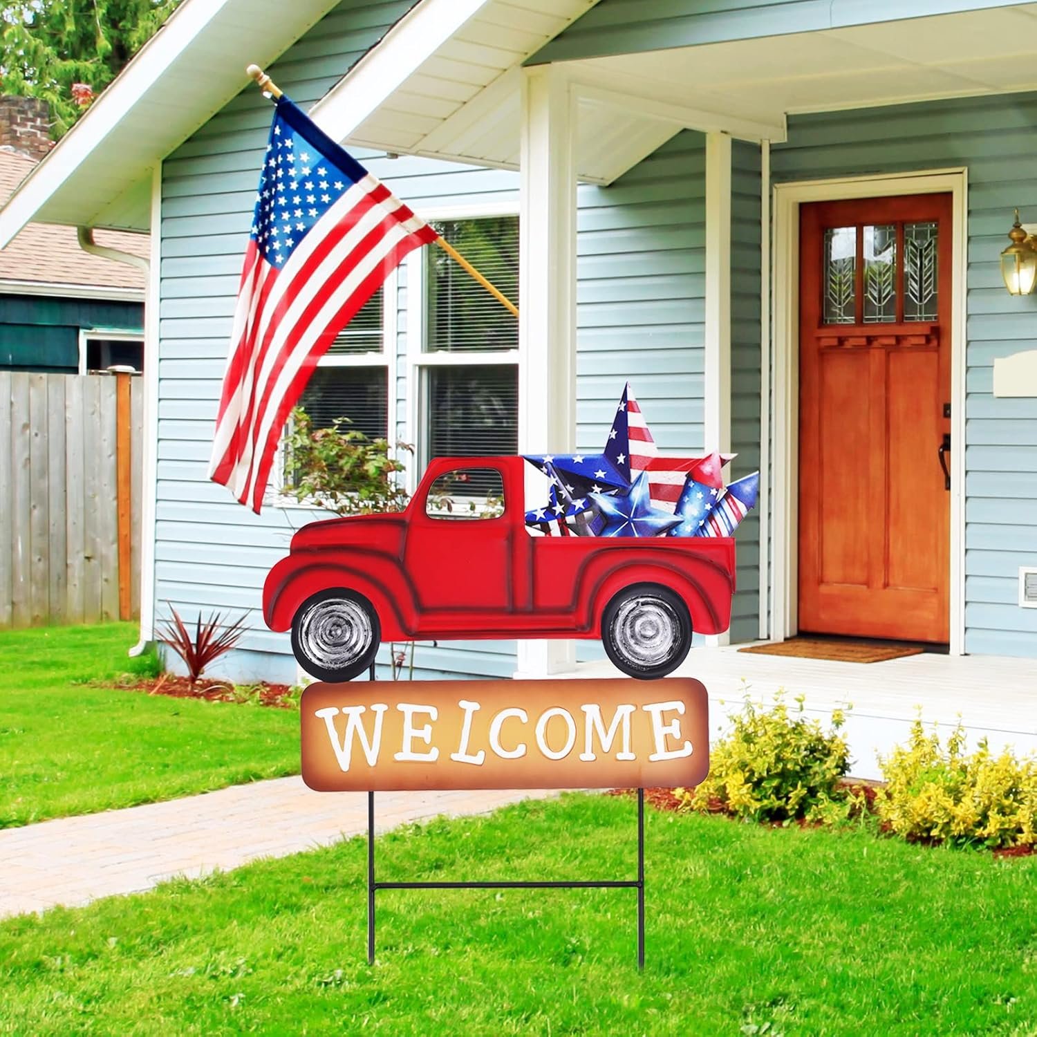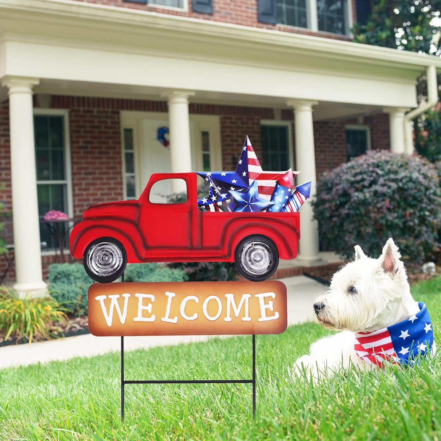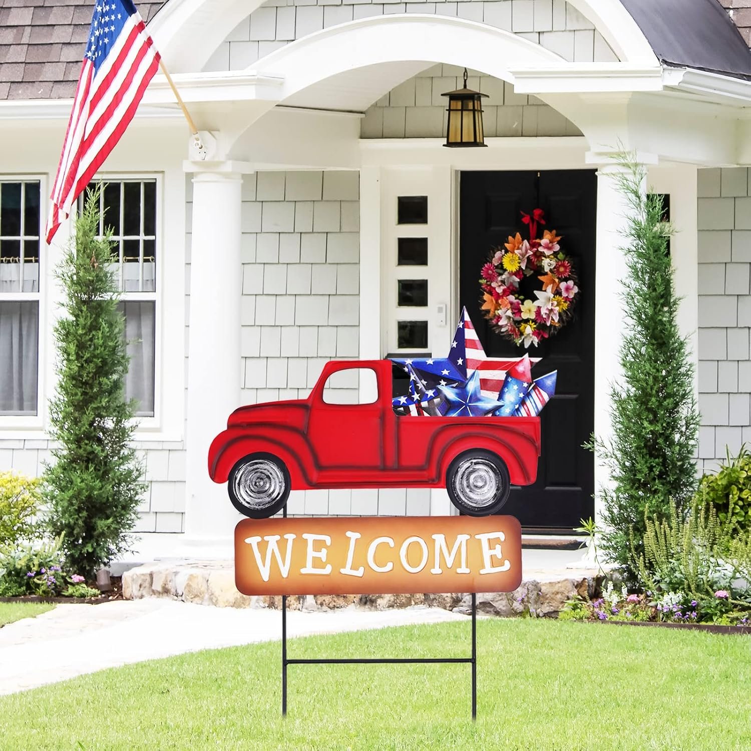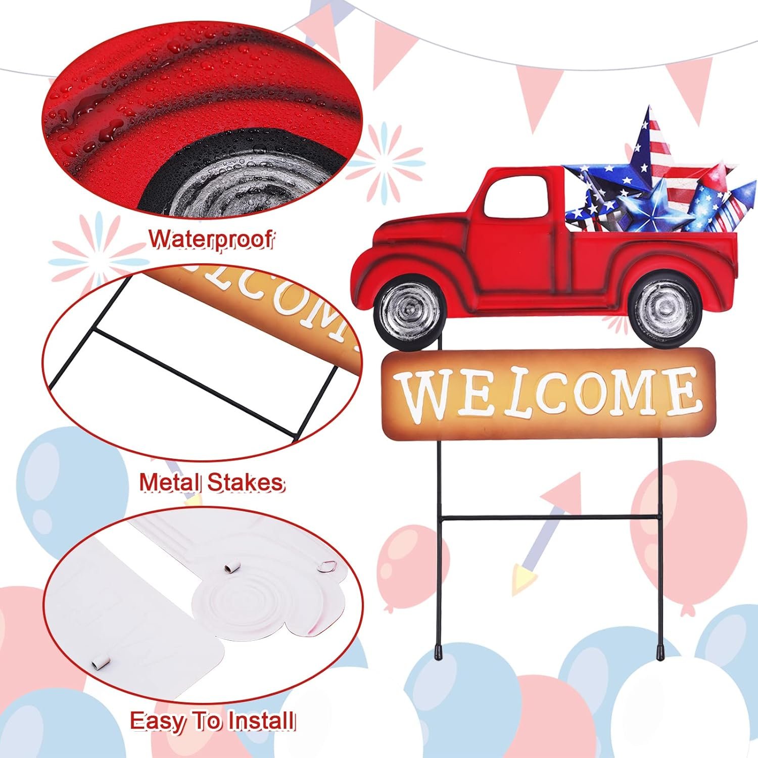 Whaline Patriotic Metal Yard Stakes 4th of July Welcome Interchangeable Garden Stake Red Truck Decor Set with Seasonal Sign Loads, Set of 9