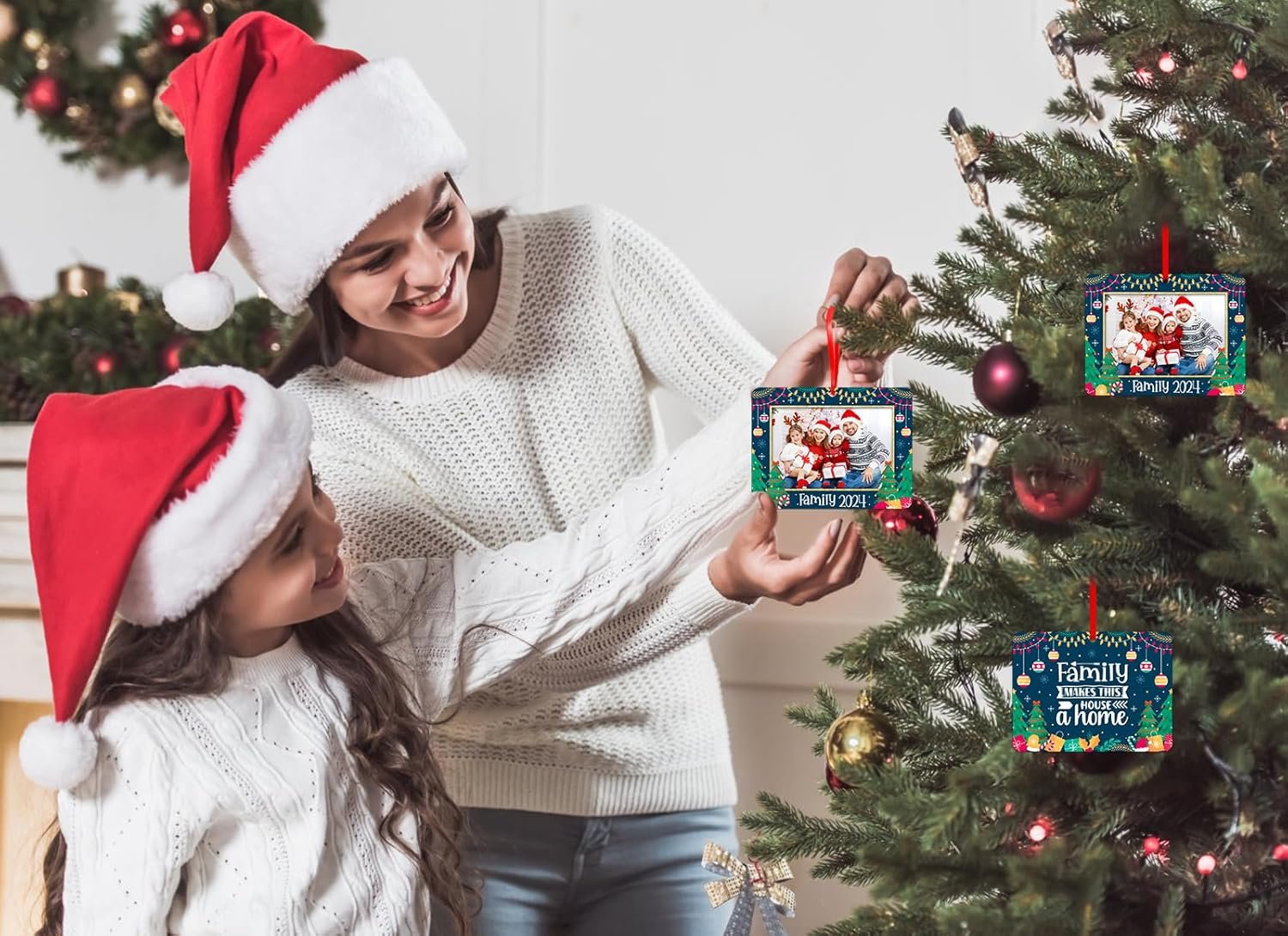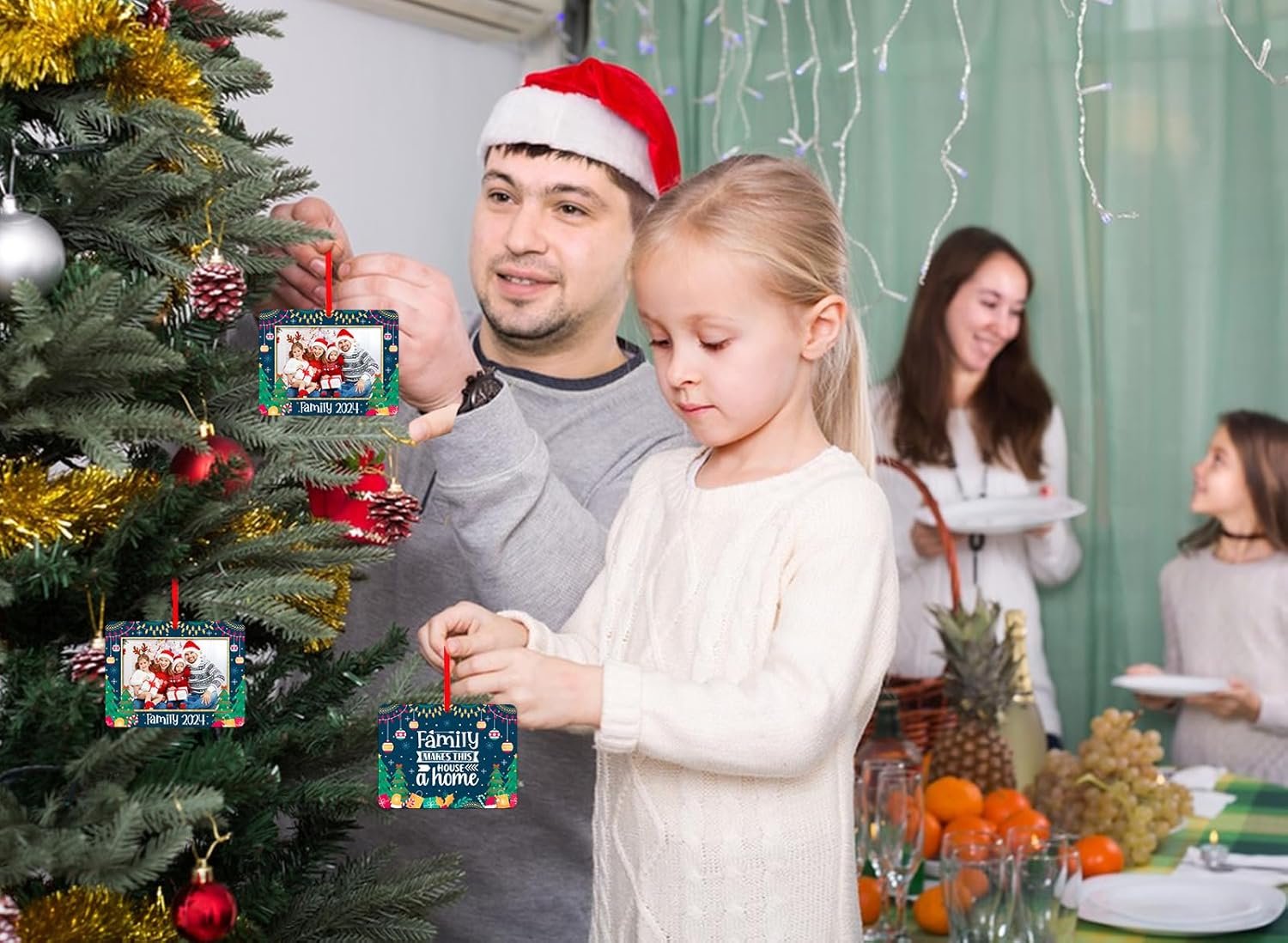 【Personalized Picture Frame Family Christmas Tree Ornament】: The family Christmas photo frame ornament features a double-sided design, the front side of the ornament is for showing family 2024 personalized pictures and the back side with warm words “Family Makes this House a Home” and beautiful Christmas trees patterns. Hanging these family Christmas photo ornaments on Christmas tree decorations to adding more beautiful Christmas theme elements.