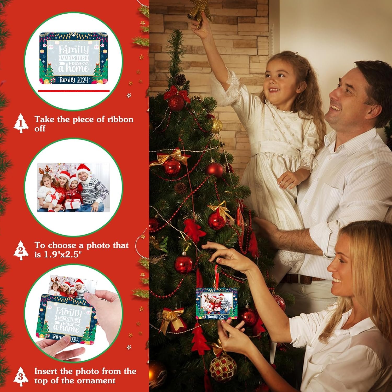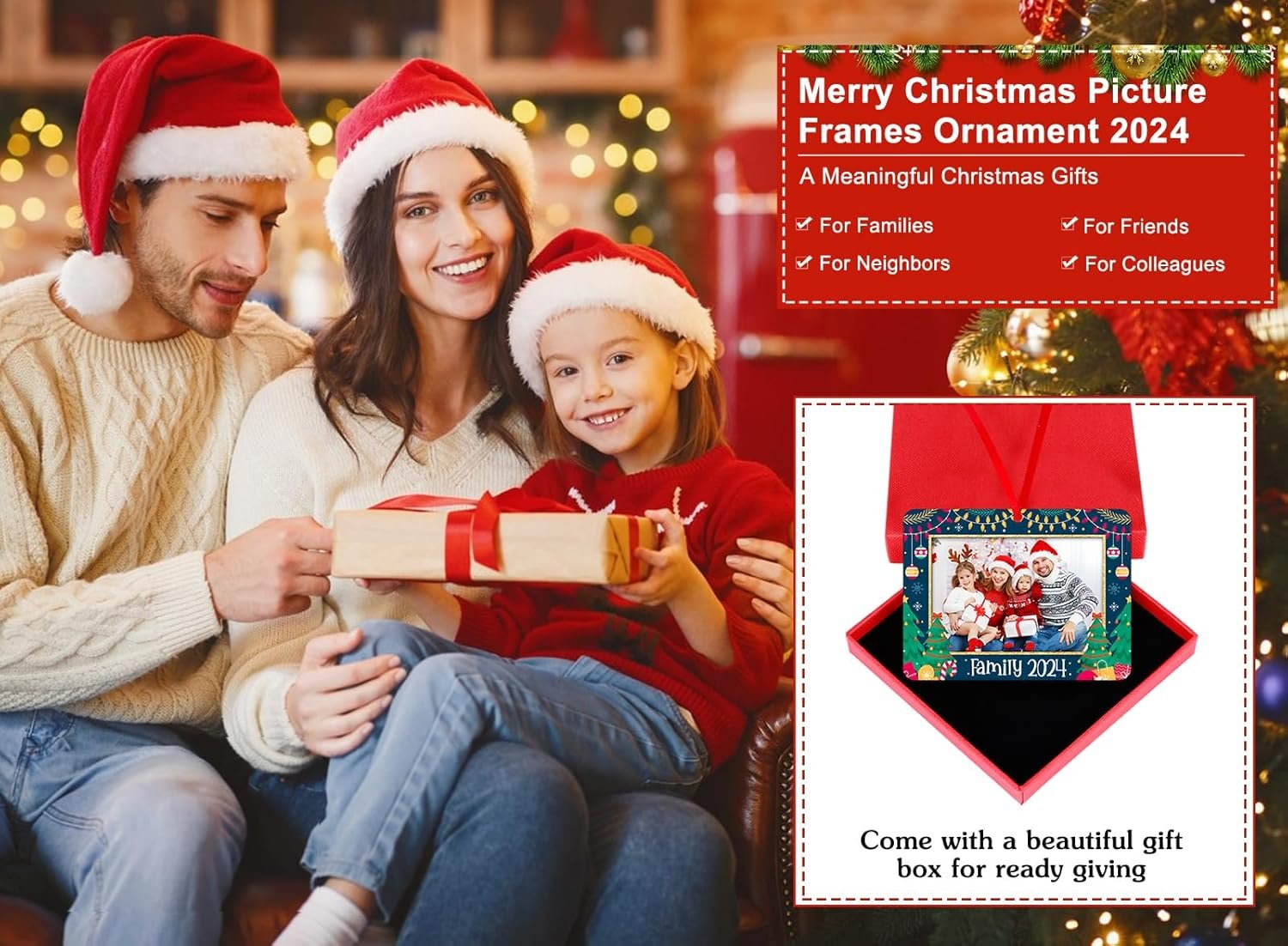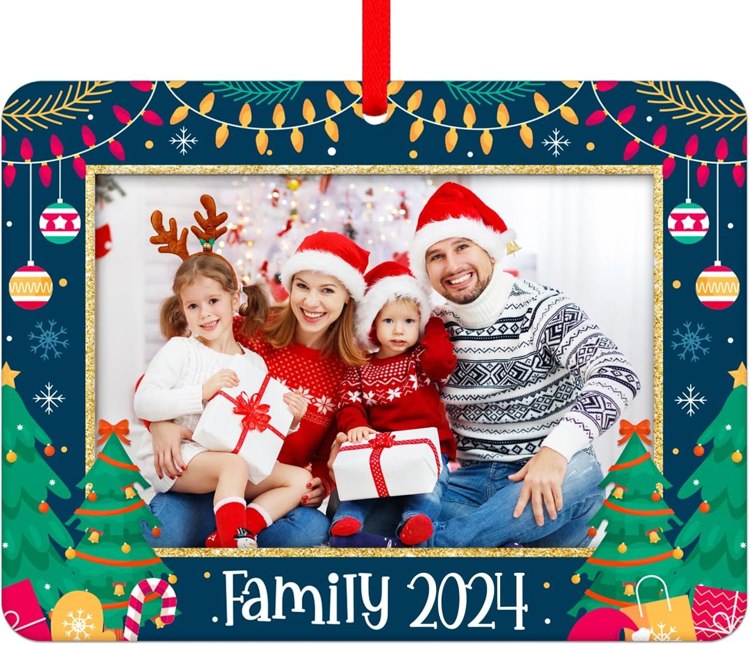 【Family Christmas Picture Frames Ornaments 2024】: Personalized picture frame family Christmas tree ornament 2024 measures 2.4 “x3.2 “, each merry Christmas photo frame hanging ornament comes with a red ribbon easy to hang on the Christmas tree decorations and with a beautiful red gift box for ready giving.
