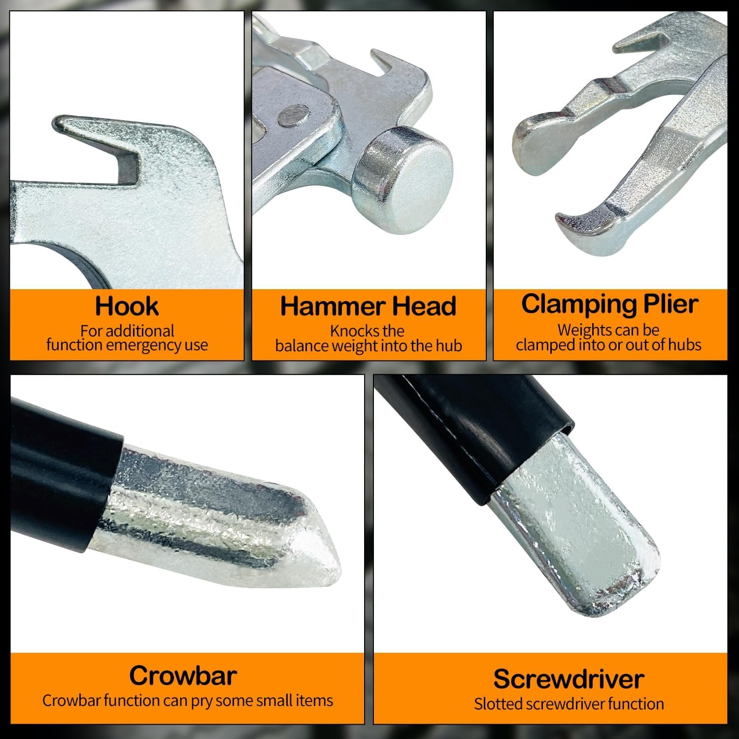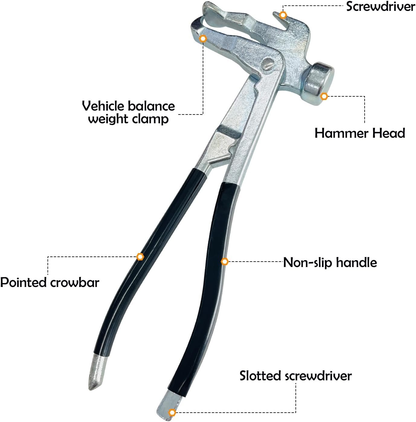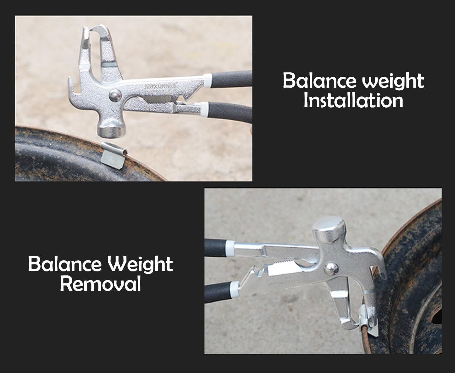 Wheel Counterweight Pliers tool hooks onto the hole in the weight and then uses leverage to slide the weight off the rim, thus easily removing the wheel weight. The hammer head is used to hammer the tightened counterweight into place.Crimp grooves are used to tighten the weight to ensure a secure installation. The end of the handle is designed with a pry bar and screwdriver for trimming clamped counterweights and other functions.