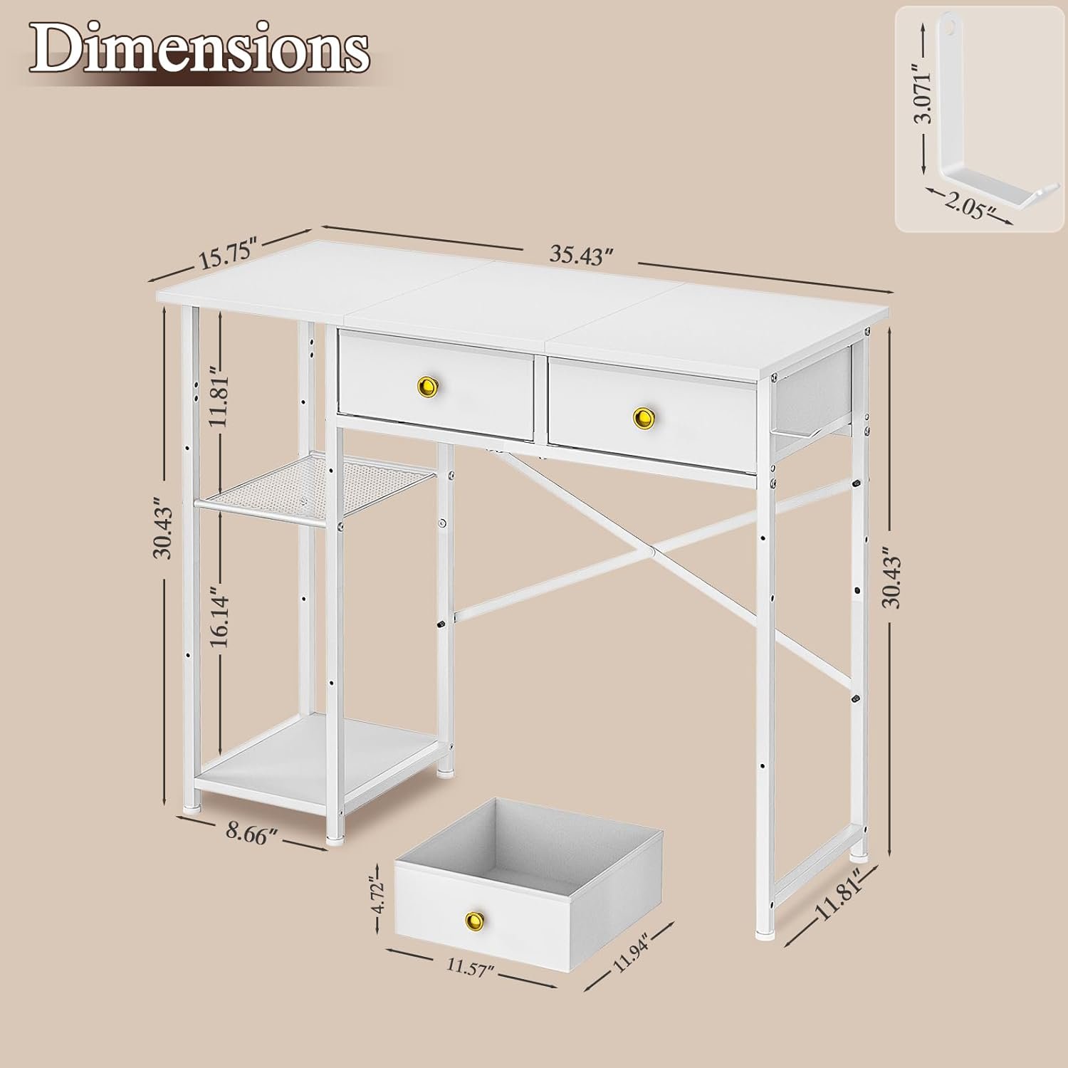 White Computer Desk, 36 Inch Small Desk with Drawers, Home Office Desk with Storage Shelves for Bedroom, Living Room, Dorm, Vanity Desk for Small Spaces, White