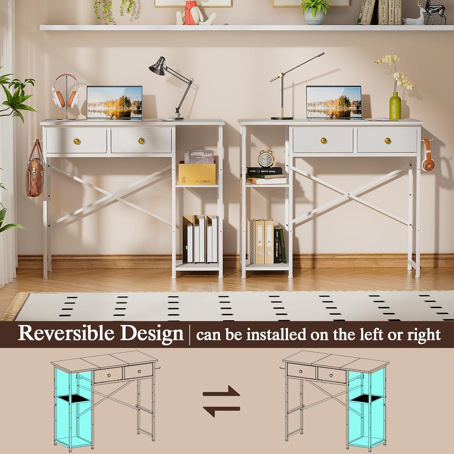 【Drawers & Shelves】The small writing desk comes with 2 practical fabric drawers and 2 storage shelves on the side, providing you with plenty of storage space, perfect for documents, stationery and other office supplies etc. helping you keep your desktop neat and organized. The shelves can be installed on the left or right side as required to flexibly adapt to your usage habits, and both mounting options are illustrated, making it a great choice for bedrooms, dens and offices.