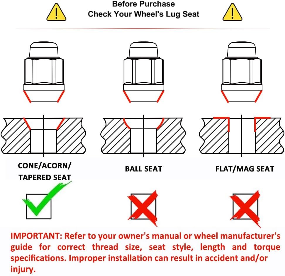 ATTENTION: Refer to the owner’s manual or the wheel manufacturer’s guide for the correct thread size, seat style, length, hex and torque specifications. You assume all liability of improper installation which can result in accident and/or injury.