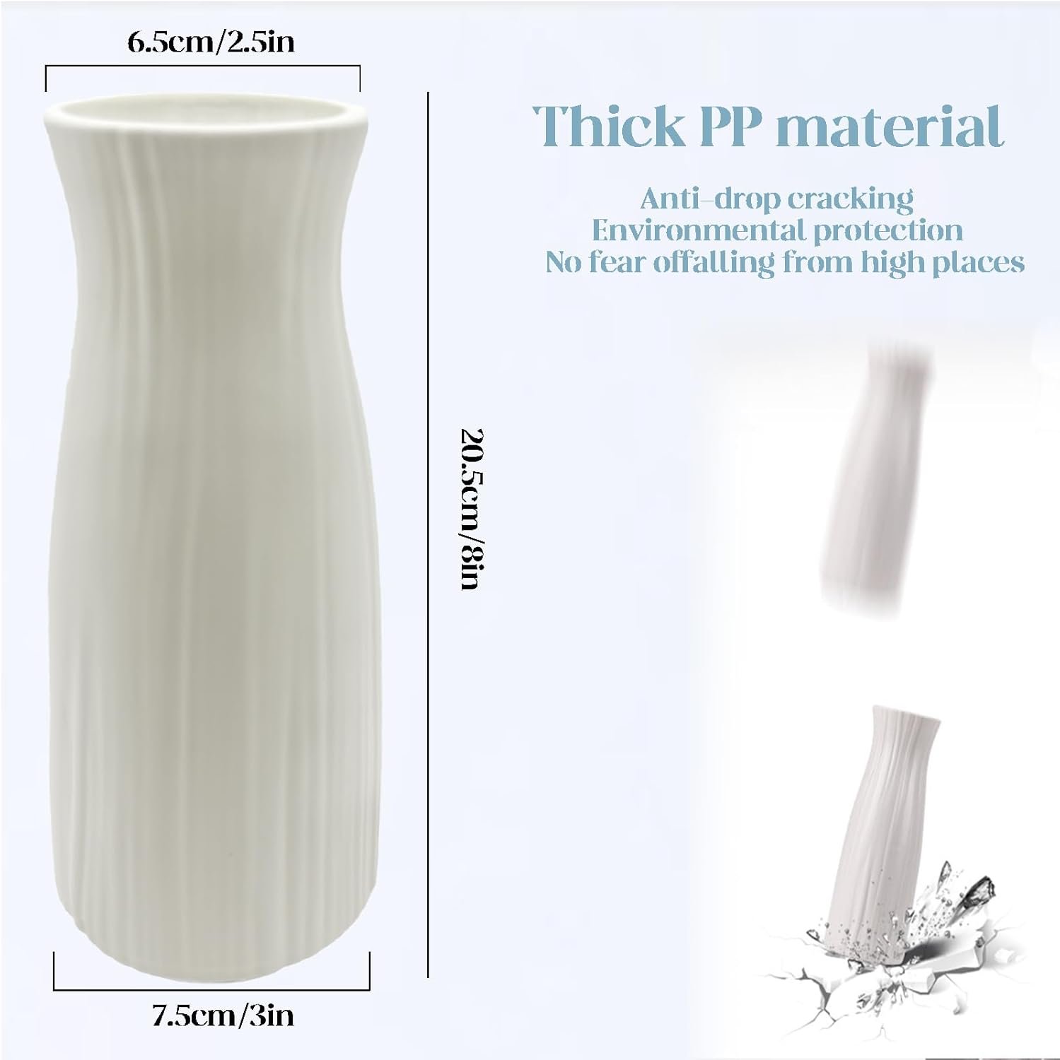Vase size: The size of the vase is 8 inches high and 3 inches wide. It is a small vase used to decorate the desk. The elegant white color matches well with the flowers you put in the vase and can be decorated anywhere