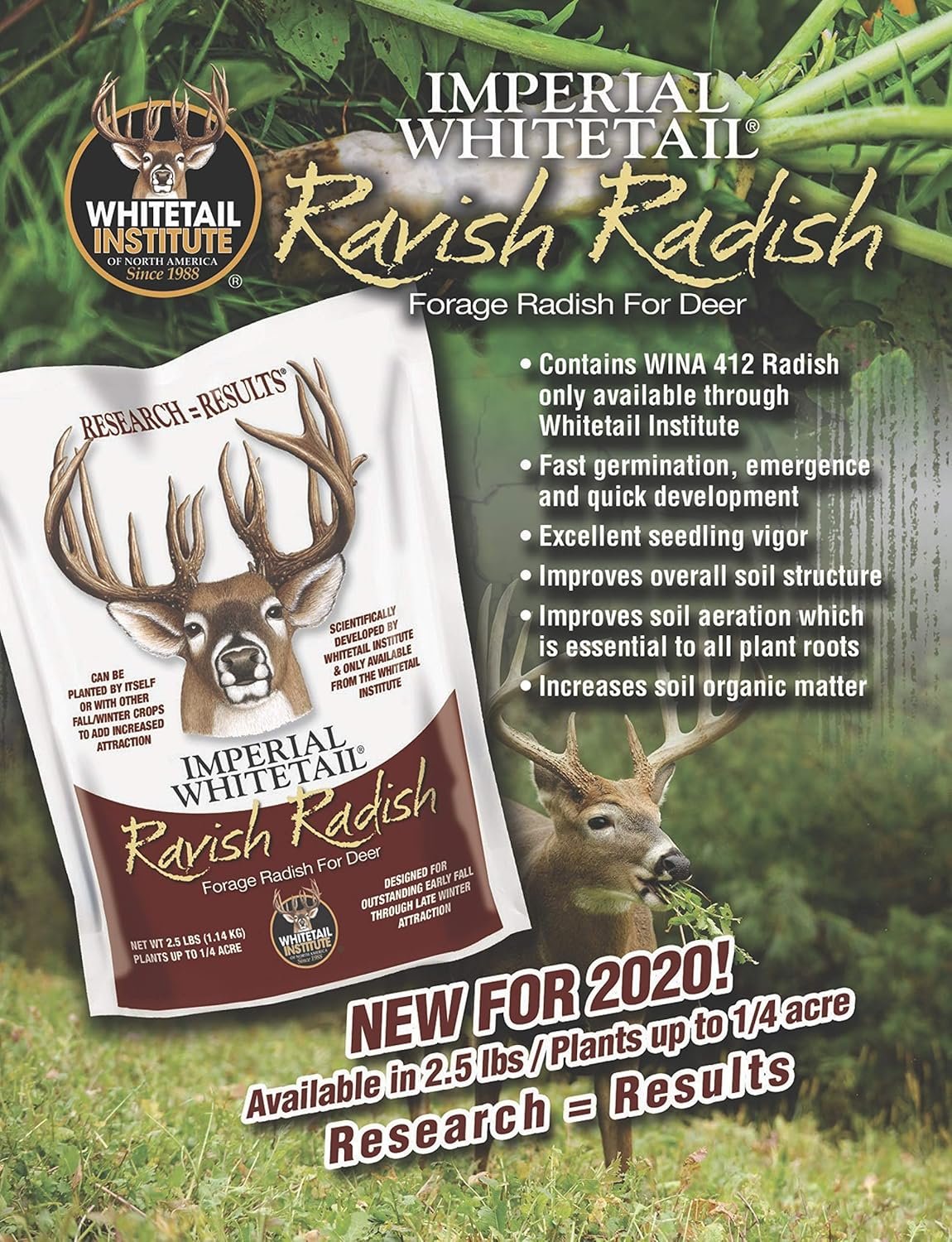 The NEW proprietary radish varieties are included in ratios that Whitetail Institute testing has proven can provide abundant, highly attractive forage from early fall through late winter, as well as tubers to help deer through the harsh winter months