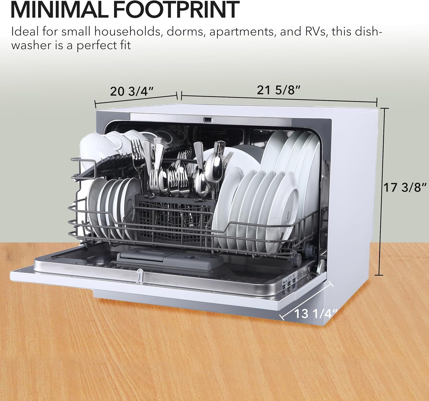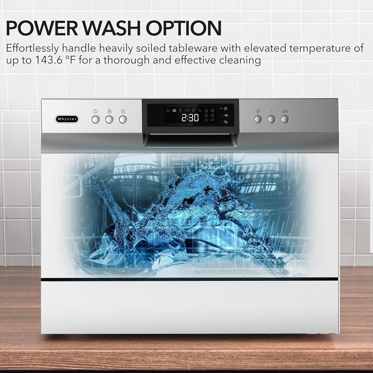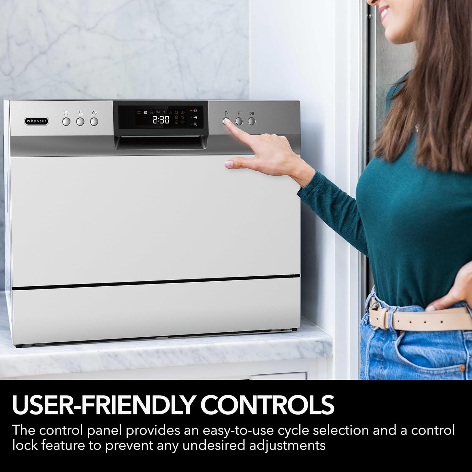 Save time and water with the Whynter Countertop Portable Dishwasher. This countertop portable dishwasher can accommodate up to 6 place settings and is designed to fit on most countertops and under cabinetry. The Whynter CDW-6831WES features a durable stainless steel interior for maximum sanitation and heat retention. A detergent and rinse air dispenser, 6 wash cycles for versatile use, and timer-start function allow optimal versatility and convenience. Best of all, it connects quickly to a kitchen faucet without the need for direct plumbing or permanent hook-up. With its compact size and easy maneuverability, the Whynter CDW-6831WES countertop dishwasher is a great choice for your RV, cabin, vacation home or any space constrained location. ? Six (6) standard place setting capacity ? Six (6) standard wash cycles (Heavy, Normal, Baby Care, ECO, Glass, Speed) ? Stainless steel interior and spray arm for extended durability ? Dish rack and silverware basket ? User friendly controls ? 1-24 hour delay start lets you wash dishes at your own convenience ? Automatic detergent and rinse agent dispenser ? Quick connect adapter for most kitchen faucets included for quick and simple connection ? Drain and inlet hose included ? AC (120V/60Hz) ? Total Amps: 5.7A ? Heater: 5.0A ? Water pressure: 0.041.0MPa ? Maximum water temperature: 140°F ? Phase: Single.