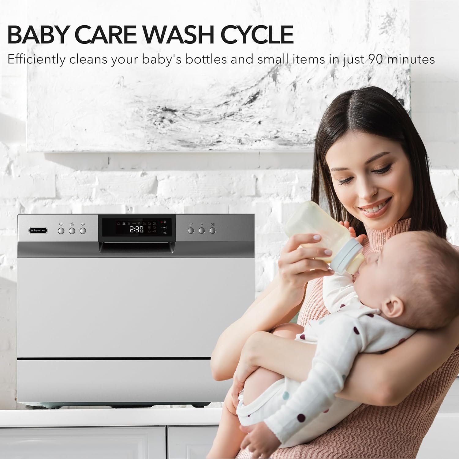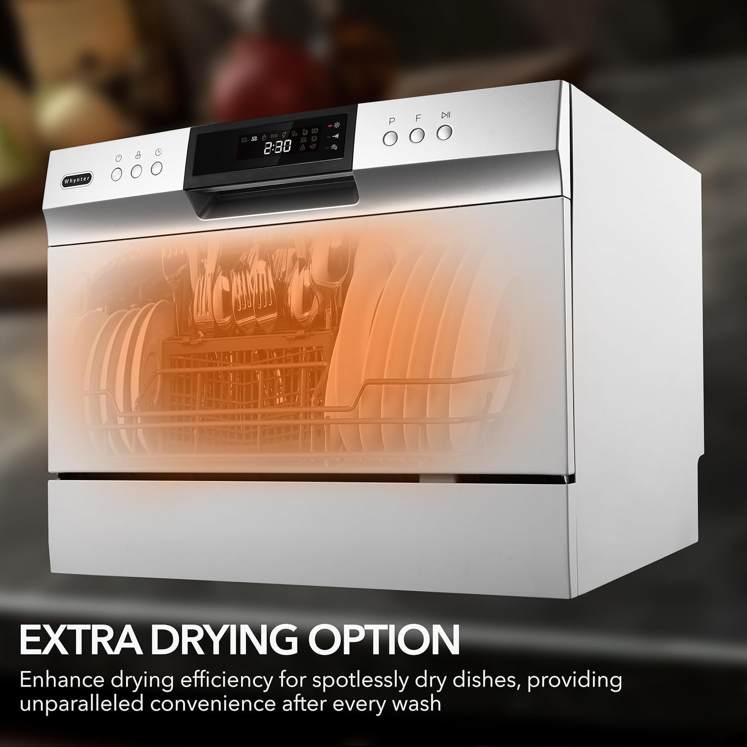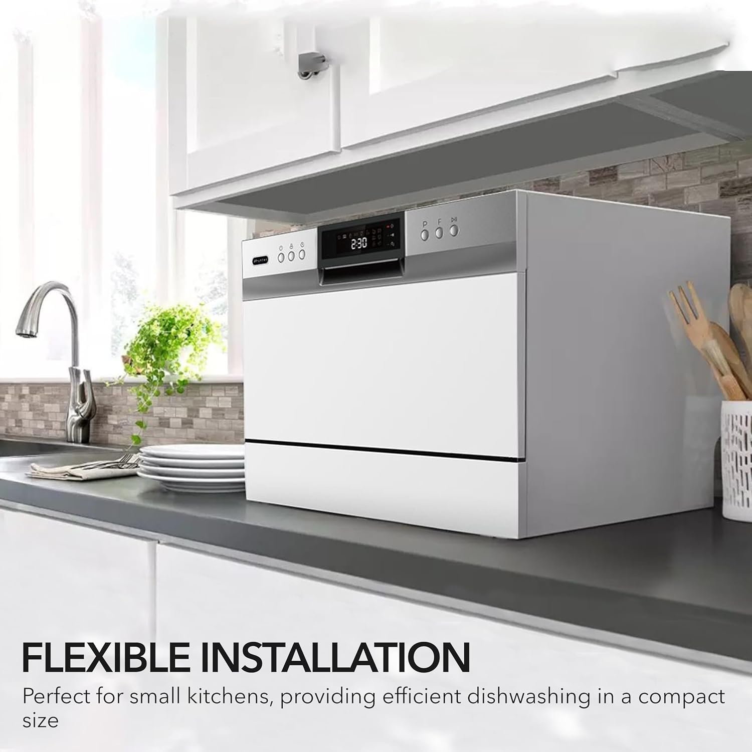 Save time and water with the Whynter Countertop Portable Dishwasher. This countertop portable dishwasher can accommodate up to 6 place settings and is designed to fit on most countertops and under cabinetry. The Whynter CDW-6831WES features a durable stainless steel interior for maximum sanitation and heat retention. A detergent and rinse air dispenser, 6 wash cycles for versatile use, and timer-start function allow optimal versatility and convenience. Best of all, it connects quickly to a kitchen faucet without the need for direct plumbing or permanent hook-up. With its compact size and easy maneuverability, the Whynter CDW-6831WES countertop dishwasher is a great choice for your RV, cabin, vacation home or any space constrained location. ? Six (6) standard place setting capacity ? Six (6) standard wash cycles (Heavy, Normal, Baby Care, ECO, Glass, Speed) ? Stainless steel interior and spray arm for extended durability ? Dish rack and silverware basket ? User friendly controls ? 1-24 hour delay start lets you wash dishes at your own convenience ? Automatic detergent and rinse agent dispenser ? Quick connect adapter for most kitchen faucets included for quick and simple connection ? Drain and inlet hose included ? AC (120V/60Hz) ? Total Amps: 5.7A ? Heater: 5.0A ? Water pressure: 0.041.0MPa ? Maximum water temperature: 140°F ? Phase: Single.