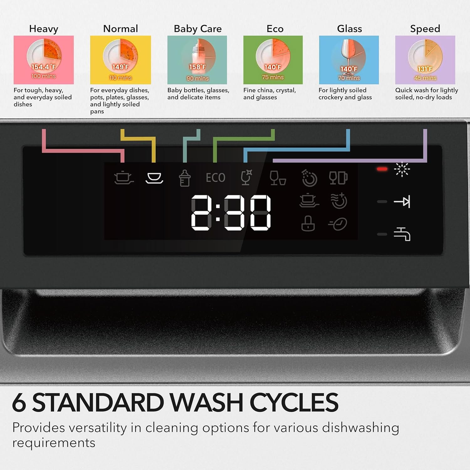 Six (6) standard wash cycles (Heavy, Normal, Baby Care, ECO, Glass, Speed)