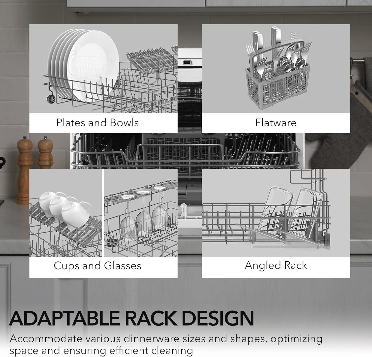 Dish rack and silverware basket; Drain and inlet hose included; 1-24 hour timer function