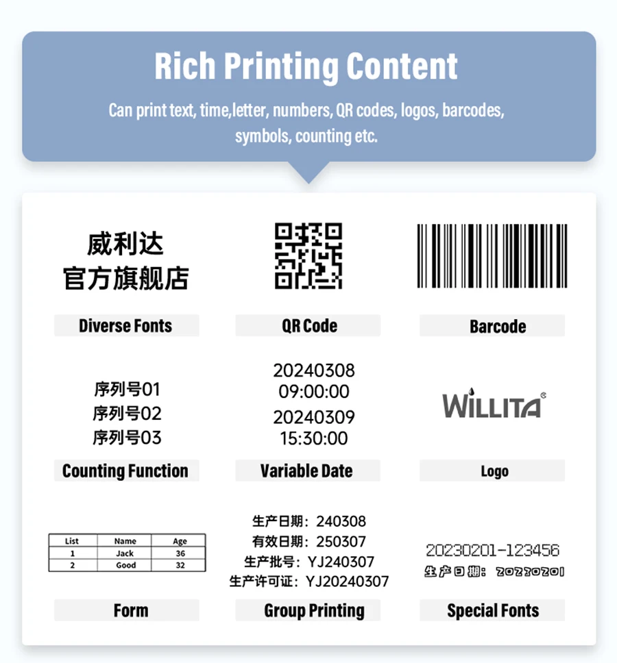 Willita Paging Coding Machine For Plastic Paper Bags Labels ID Cards Expiry Date Barcode Batch QR Online Thermal Inkjet Printers