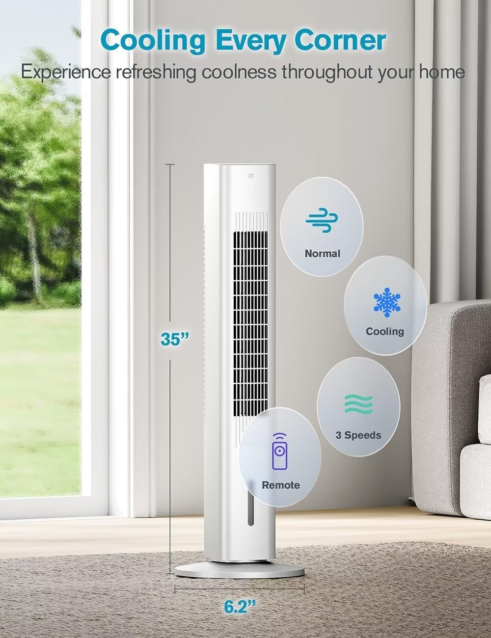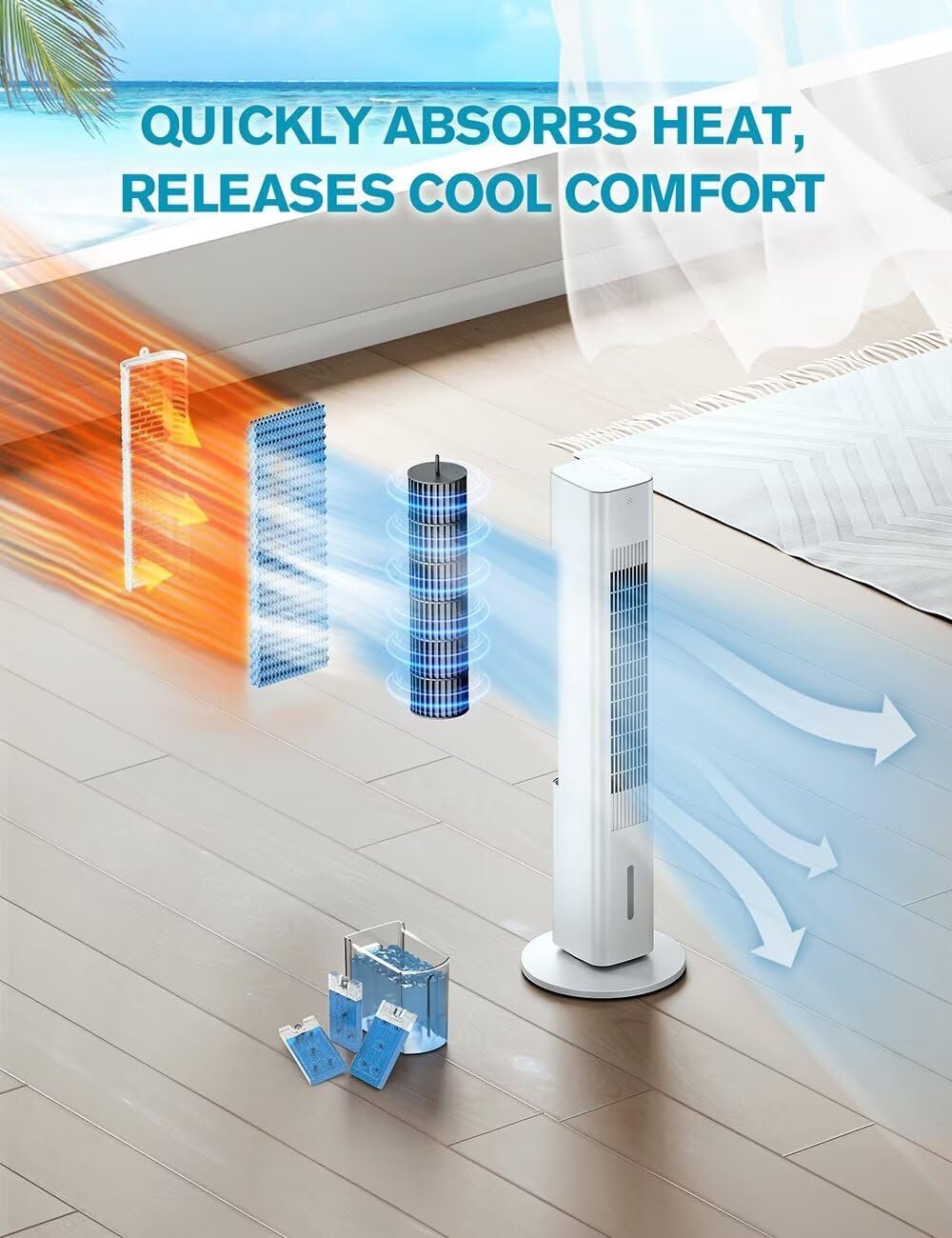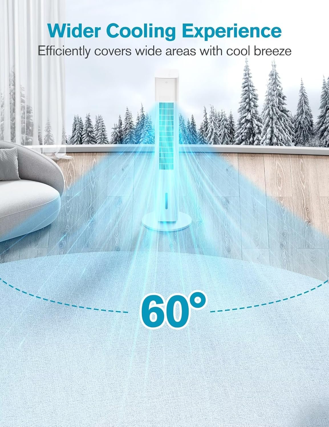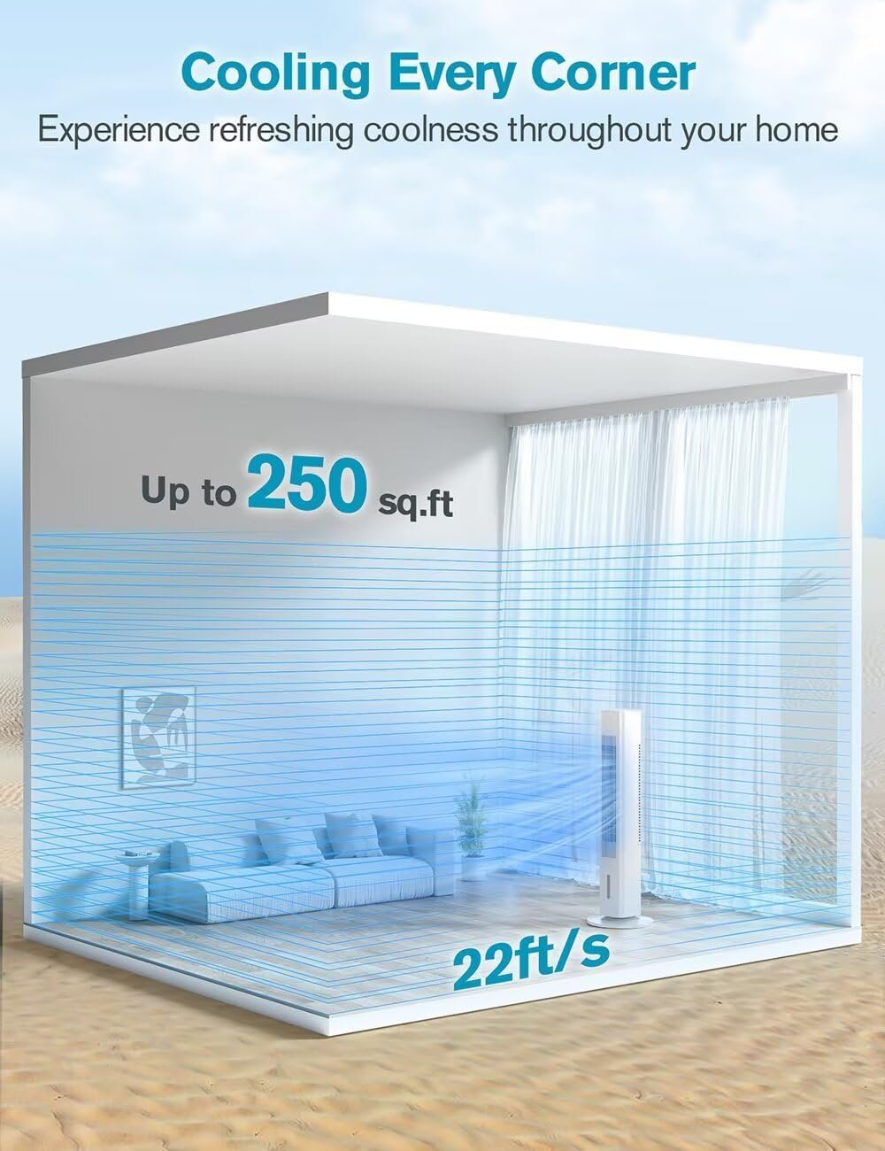 ❄[𝟮𝟮𝗳𝘁/𝘀 𝗔𝗶𝗿 𝗩𝗲𝗹𝗼𝗰𝗶𝘁𝘆 𝗮𝗻𝗱 𝟲𝟬° 𝗢𝘀𝗰𝗶𝗹𝗹𝗮𝘁𝗶𝗼𝗻] The 35” evaporative air cooler, with a strong airflow of 22ft/s and a 15-inch outlet, enables it to quickly cool the room. Coupled with automatic swing 60°, ensuring cool air reaches every corner of the room in the shortest time, covering up to 250sq.ft.