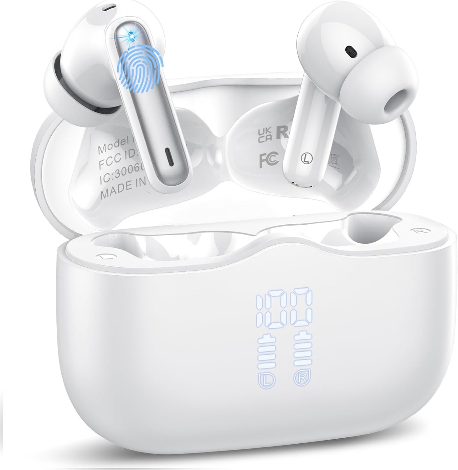 Wireless Earbuds, 2025 Bluetooth 5.4 Headphones in Ear with Stereo Deep Bass, 40H Bluetooth Ear Buds with 4 ENC Noise Cancelling Mics, IP7 Waterproof Earphones Hands-Free Calls Dual LED Display White