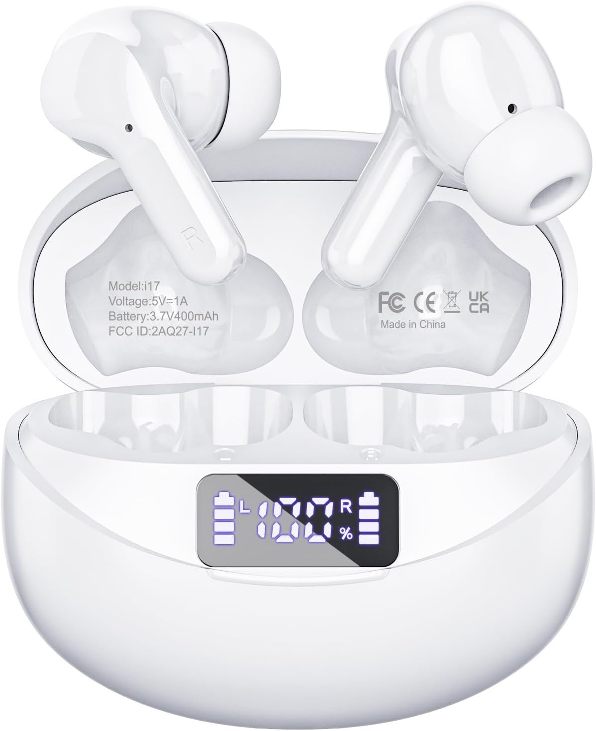 【Upgraded LED Power Display and 50H Playback】- i17 upgraded wireless earbuds with a longer battery charging case, Dual digital LED power display not only shows the charge level of the charging case but also the power level of the left and right earbuds independently for easy power management. The extra large battery capacity of the charging case can provide 3 full charges for both earbuds, each lasting 5-8 hours on a single charge, so you can enjoy 50 hours music time by the earbuds.