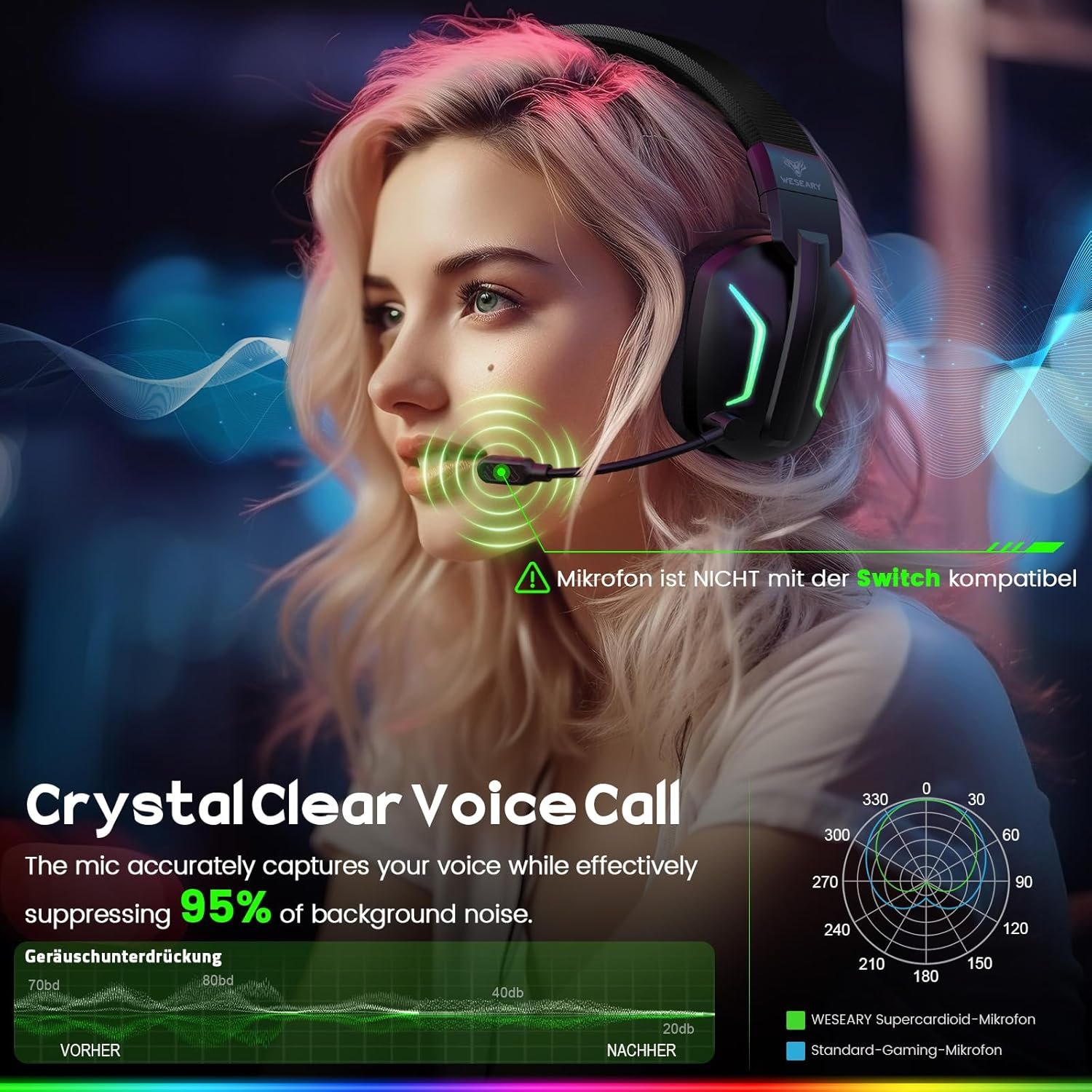 🔄 【Versatile Compatibility】 WESEARY gaming wireless headphones for PC, Switch, Mac, and laptops are your all-in-one solution, supporting 2.4GHz dongle mode, surpassing other gaming headsets in performance. Easily switch to Bluetooth 5.4 mode for mobiles, tablets, iPads, and smart devices. ❌Note 1: Both modes are NOT compatible with any Xbox.⚠️ Note 2: The microphone is NOT compatible with Switch.🚫Note 3: Bluetooth mode is NOT compatible with PS4/PS5.