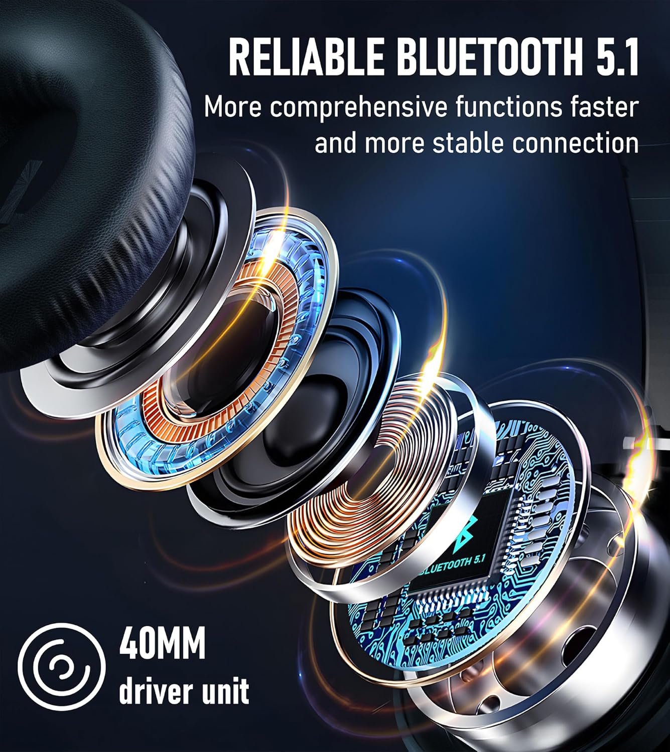 Bluetooth upgrade – Wireless headphones use the latest Bluetooth 5.1 chip,With a built-in microphone, which can connect to devices within 2 seconds after turning on. It has faster transmission speed, lower power consumption, and stronger security performance, making the headphones more power-efficient. Over-ear headphones can connect to 2 devices simultaneously, allowing you to watch movies on TV while answering calls without switching
