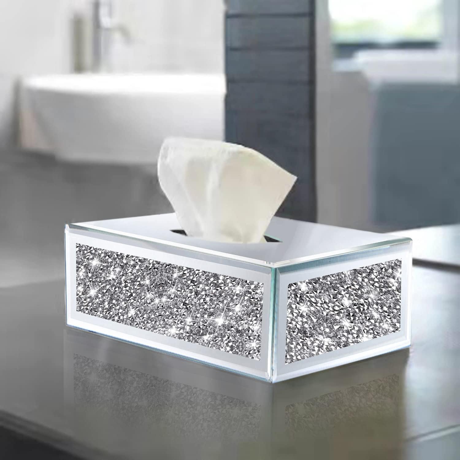 Wocred Big Rectangular Mirrored Tissue Box Cover,Crystal Crushed Diamond Tissue Box,Silver Luxury Tissue Holders for Either Tissues in a Bathroom or Napkins on a Table.(10.6”x5.9”x4.8”)