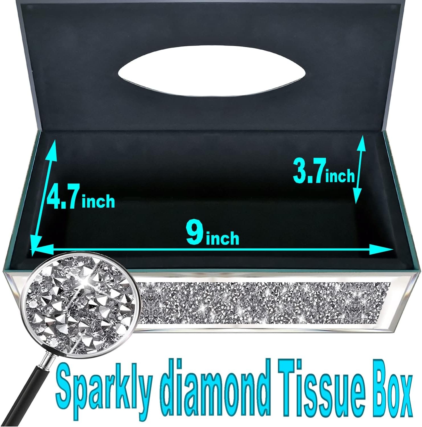 TISSUE DISPENSER:It sparkles.The four sides are surrounded by the largest range of crystal diamonds.Inside is lined in a nice soft velvet felt type material.The lid can be opened.It’s stunning on the eyes.