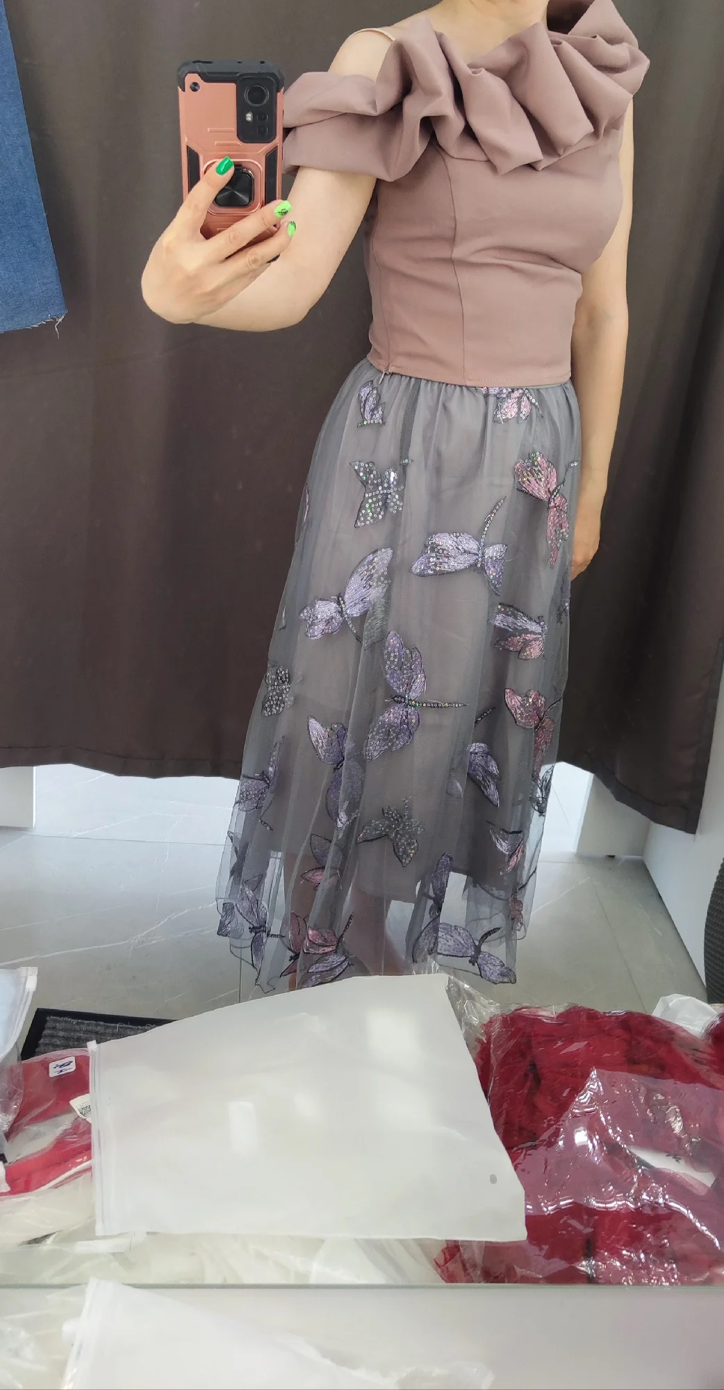 Beautiful skirt, for height 152 it’s long but not too long. One small minus is that the threads from the dragonflies are coming out. But it’s not a big deal – the sequins don’t fall off.