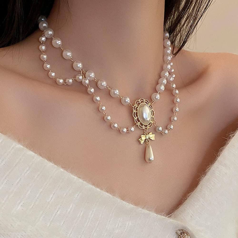 Women Bridal Vintage 1920s Imitation Pearl Necklace Layered Tassels Shiny Bow Choker Necklace Fashion Simple Necklaces for Women