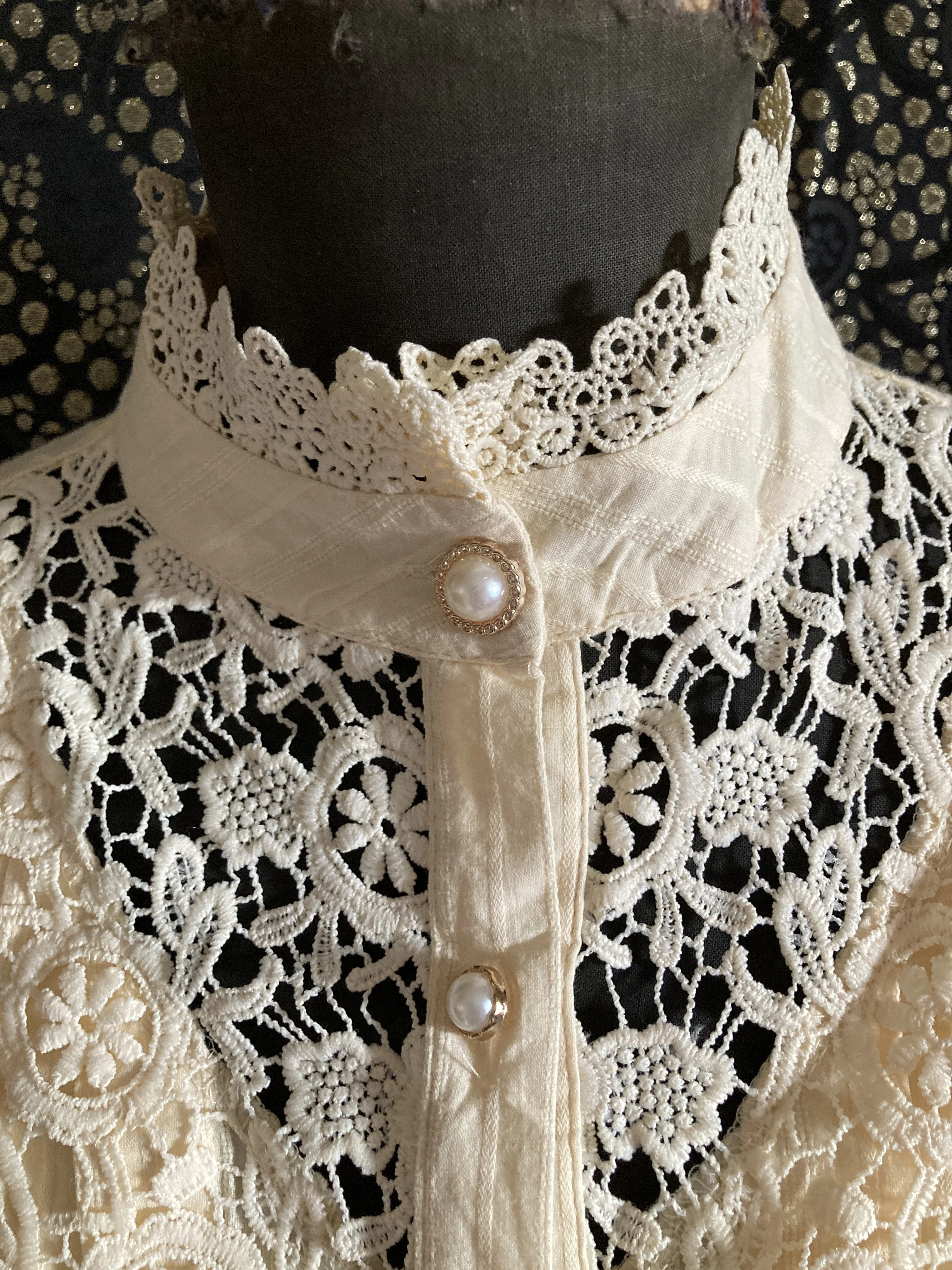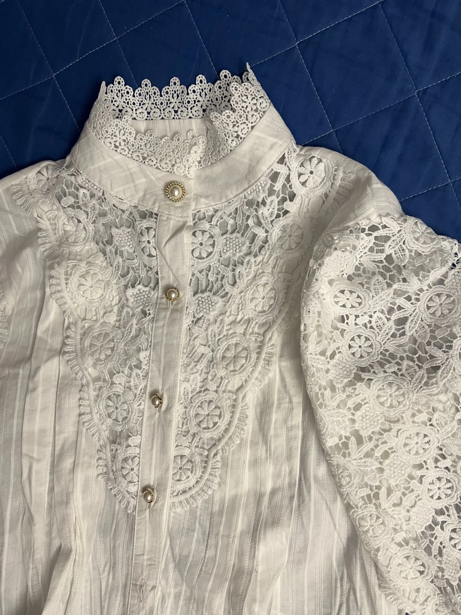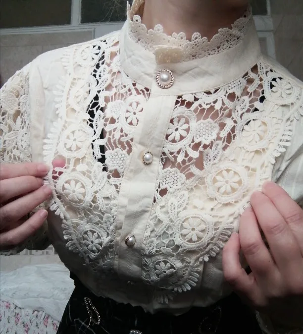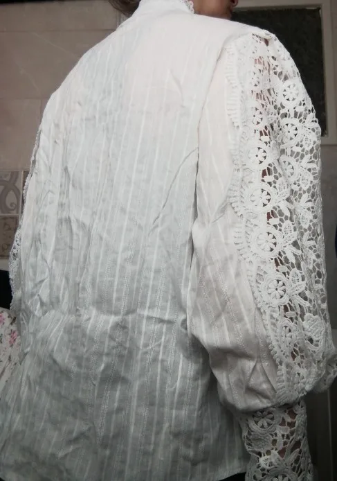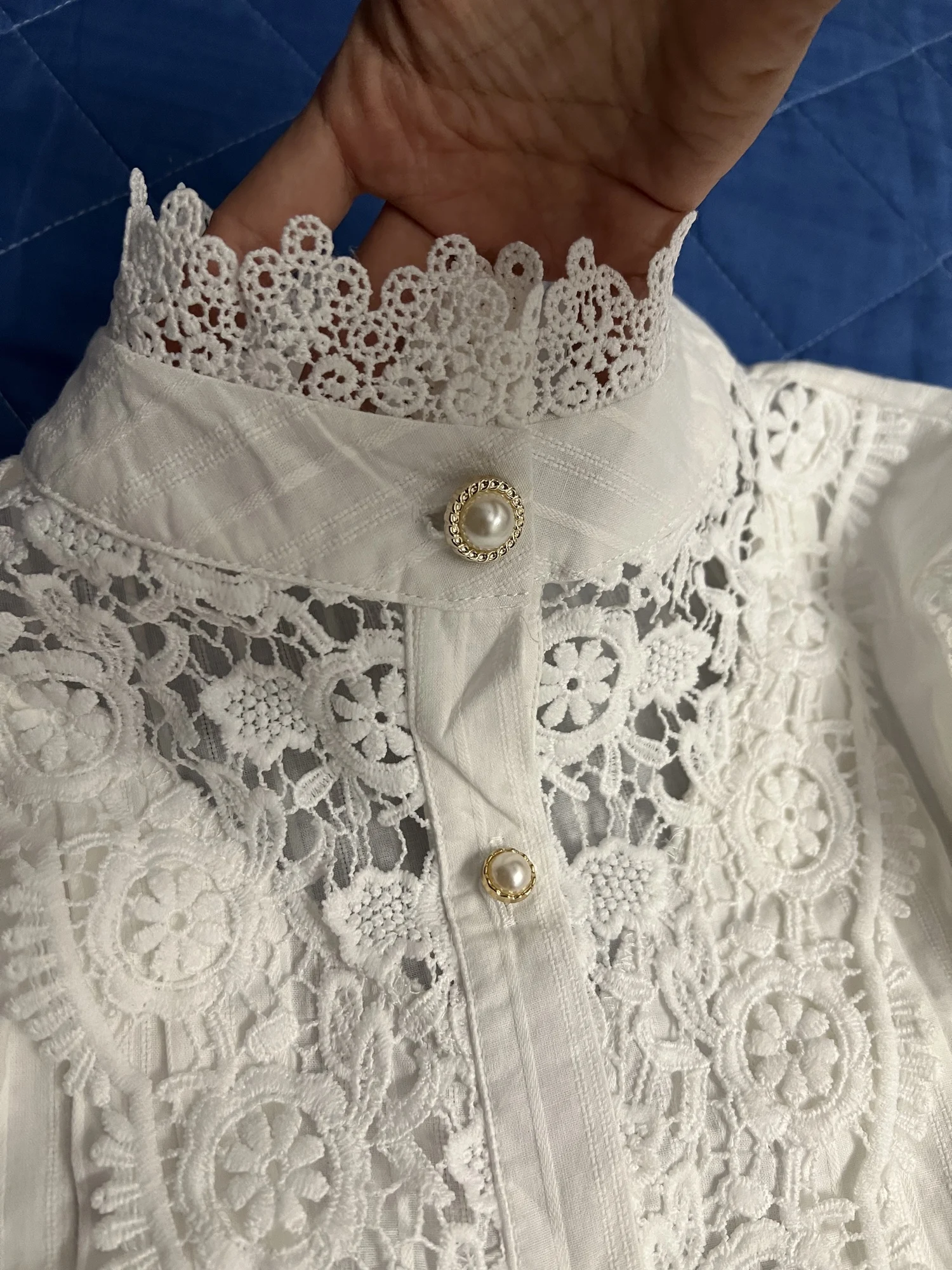 17 reviews for Women Chiffon Button Turtleneck Shirt Chic Elegant Floral Lace Fluffy Long Sleeve Top Fashion Hollow Oversize White Blouse 2025