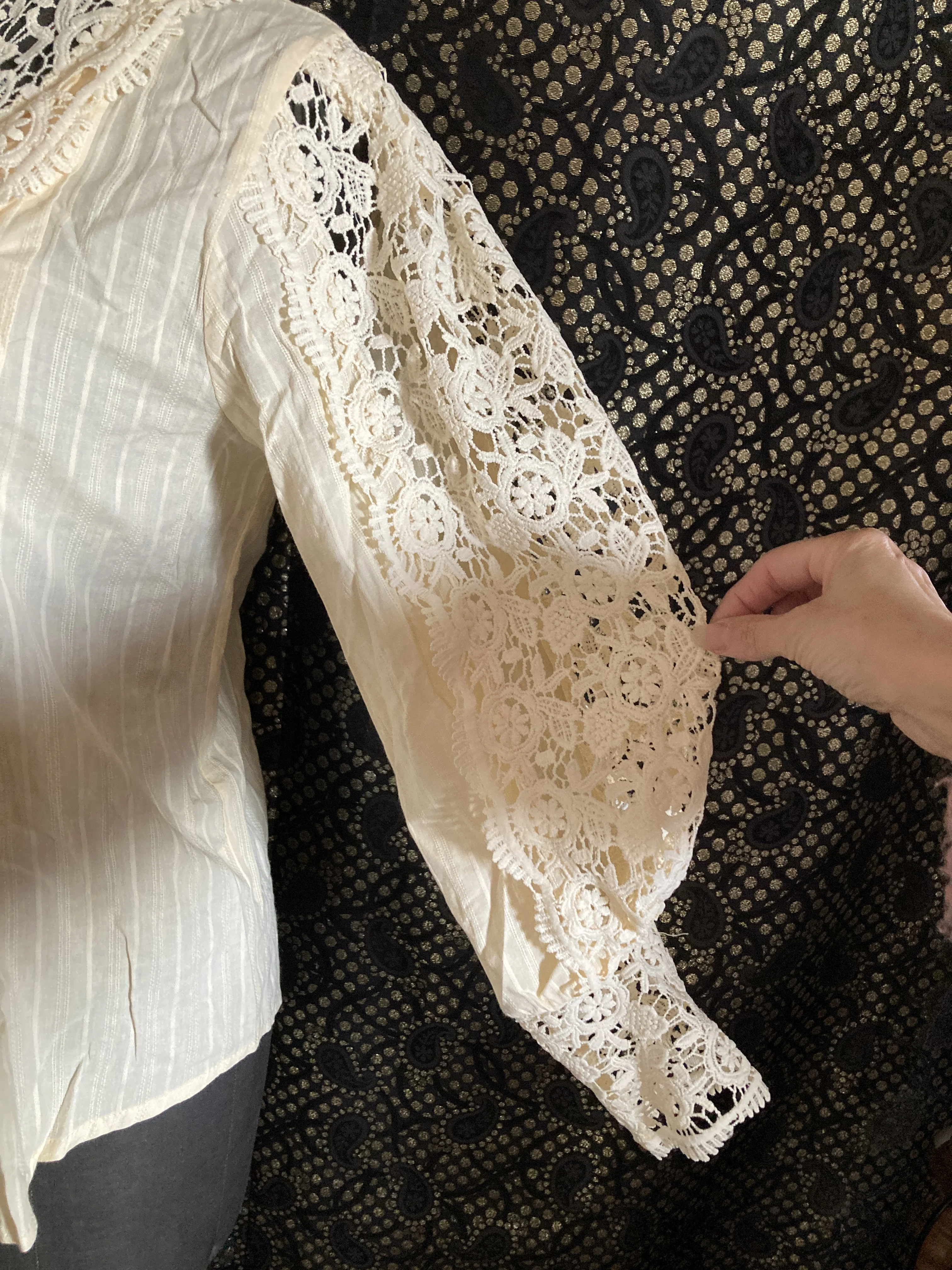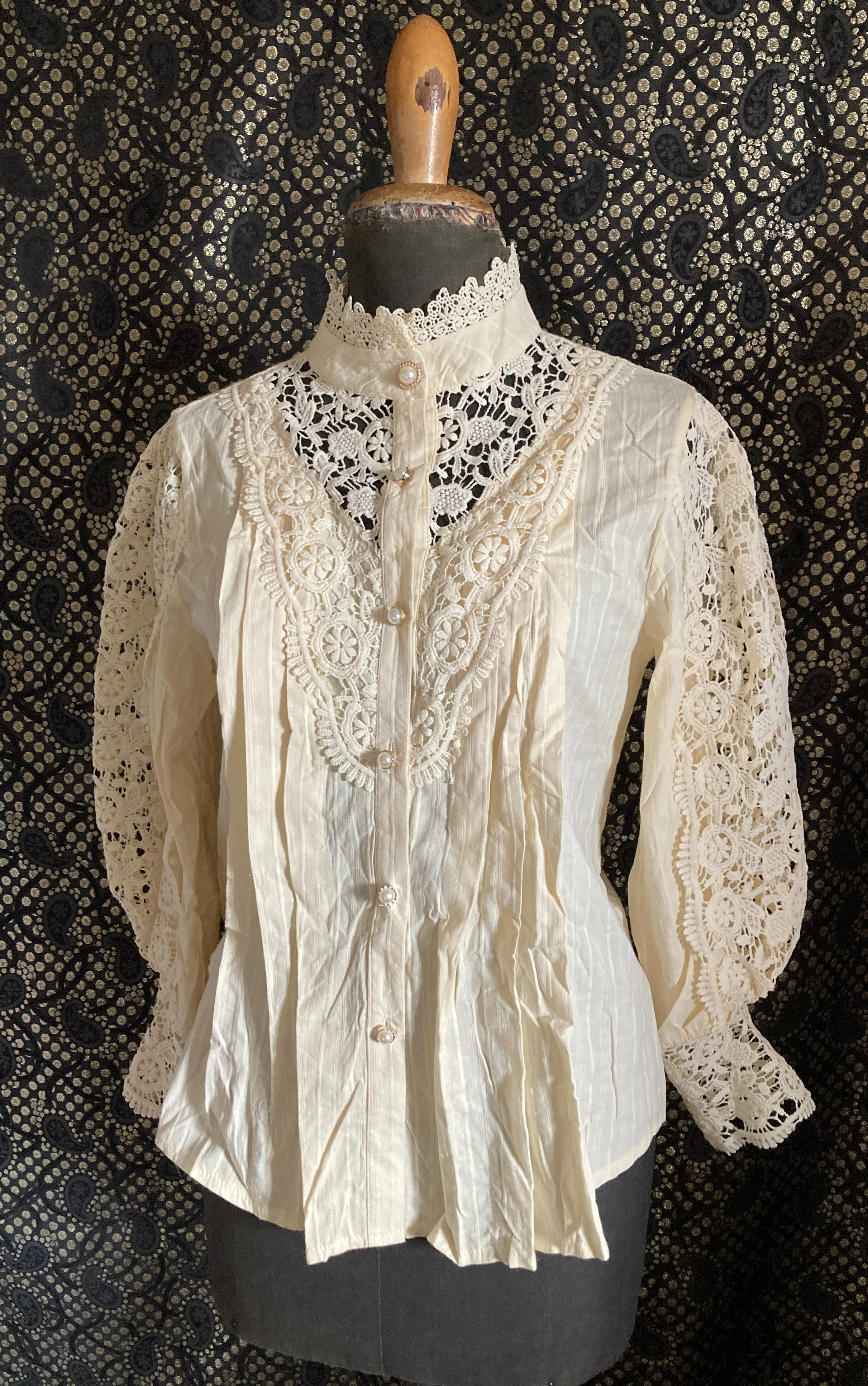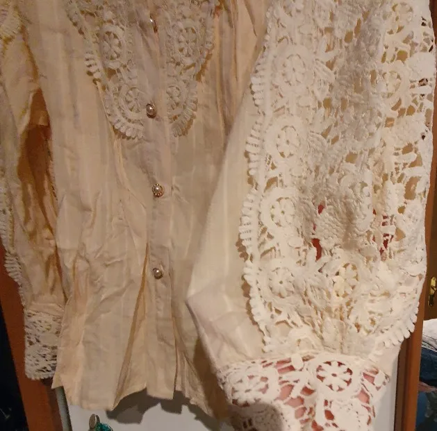 The blouse is very cute. The fabric is not chiffon (maybe polyester or viscose) but is still tactile. The lace has a beautiful effect. The color I chose “apricot” is ivory… exactly what I wanted. The measurement matches. The shipment was quick. I am very satisfied.