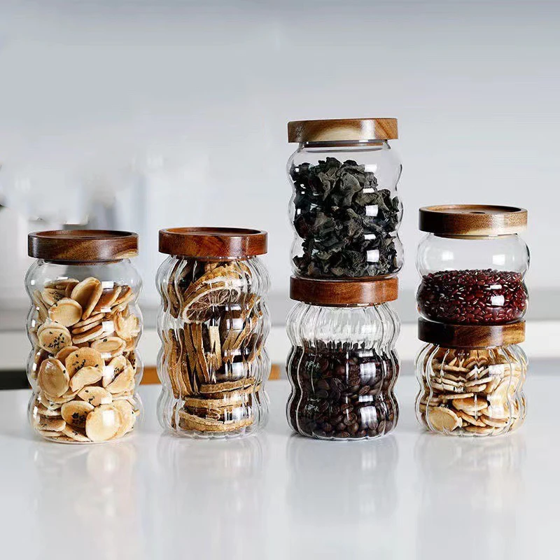 Wood Lid Striped Glass Storage Bottles Sealed Jar Tea Coffee Beans Grains Candy Jars Organizer Kitchen Food Glass Containers
