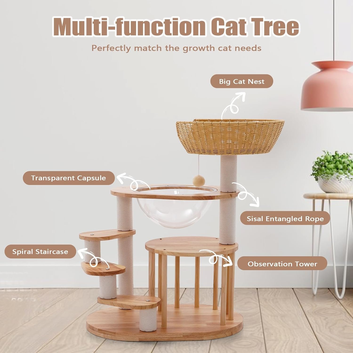 Wooden Cat Tower 31″,Wooden Cat Tree Heavy Duty Sisal-Covered Scratching Posts for Multi-Layer Cat Tree, Space Capsule Bed Easy to Assemble