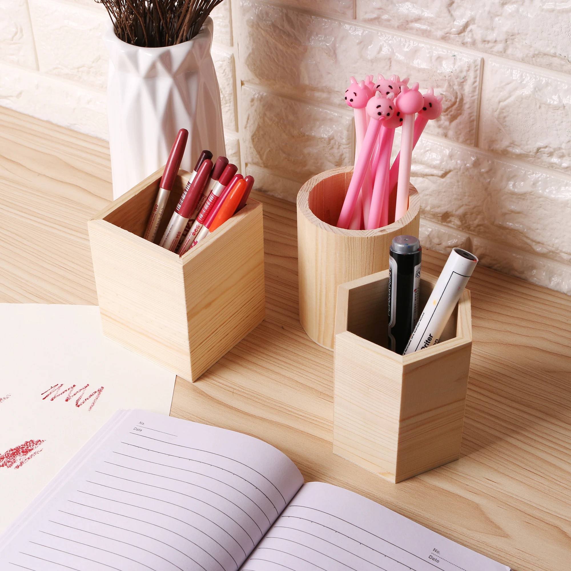 Wooden Pen Storage Box Pencil Pot DIY Office Organizer Desktop Pen Holder Makeup Brush Container Home Office Stationery Supplies