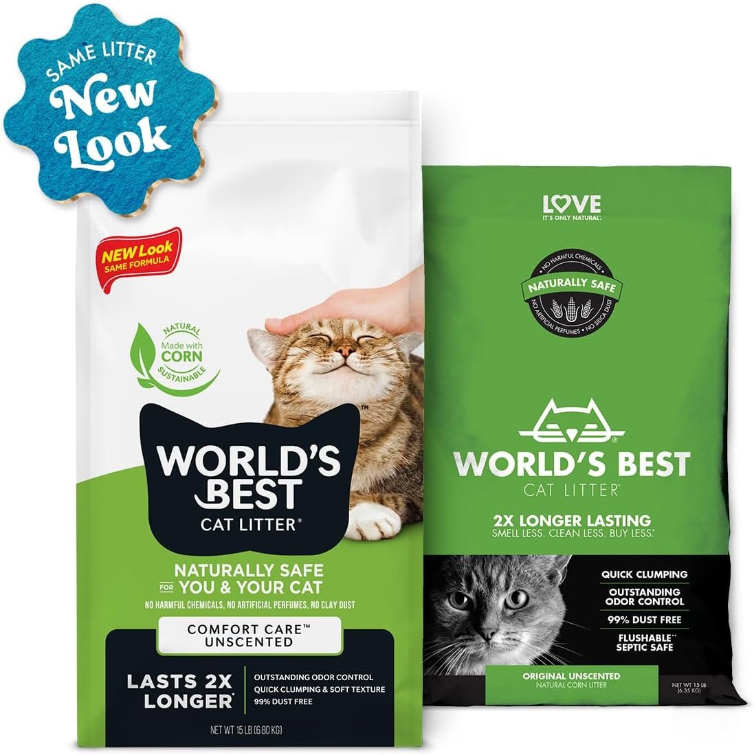 WORLD’S BEST CAT LITTER Comfort Care Unscented 15-Pounds – Natural Ingredients, Quick Clumping, Flushable, 99% Dust Free & Made in USA – Long-Lasting Odor Control & Easy Scooping