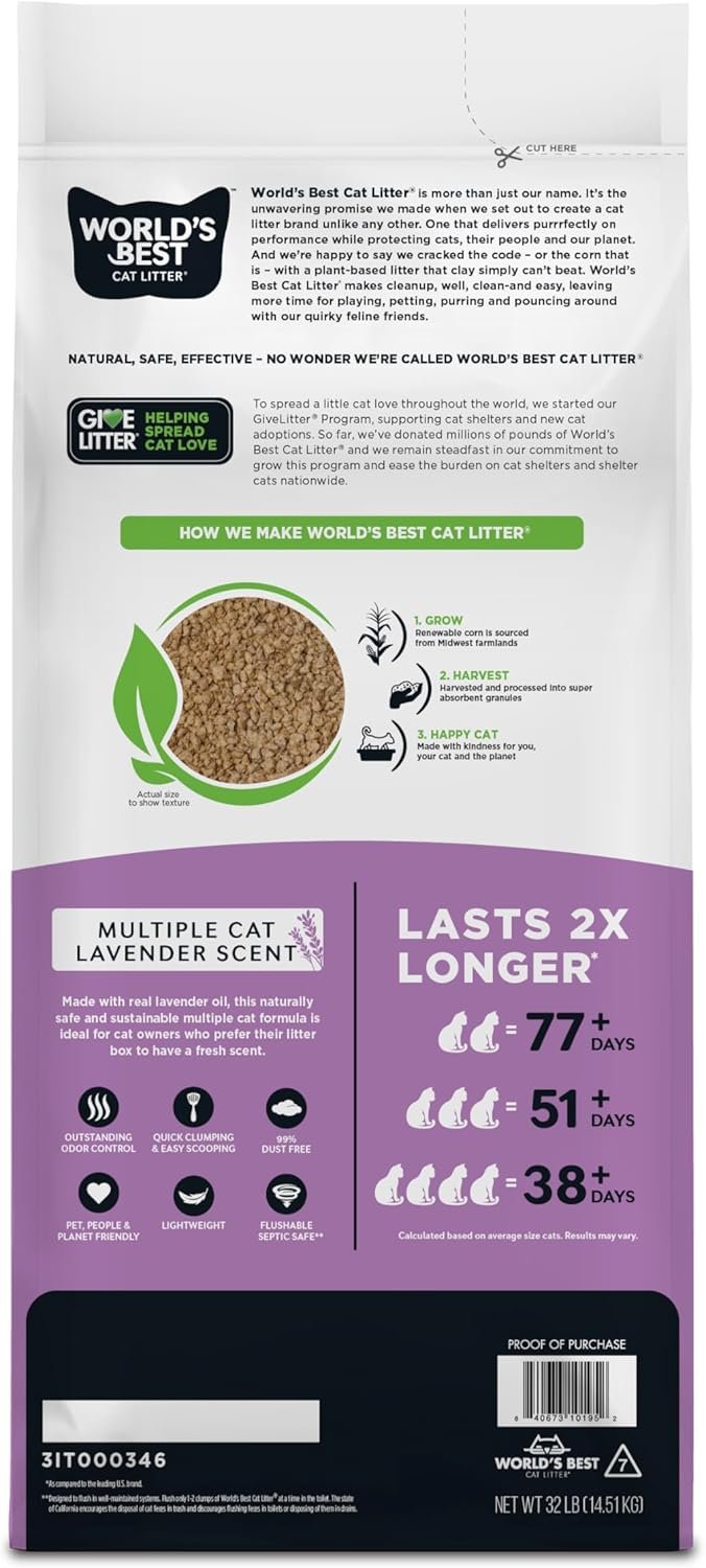 WORLD’S BEST CAT LITTER Multiple Cat Lavender Scented 32-Pounds – Natural Ingredients, Quick Clumping, Flushable, 99% Dust Free & Made in USA – Calming Fragrance & Long-Lasting Odor Control