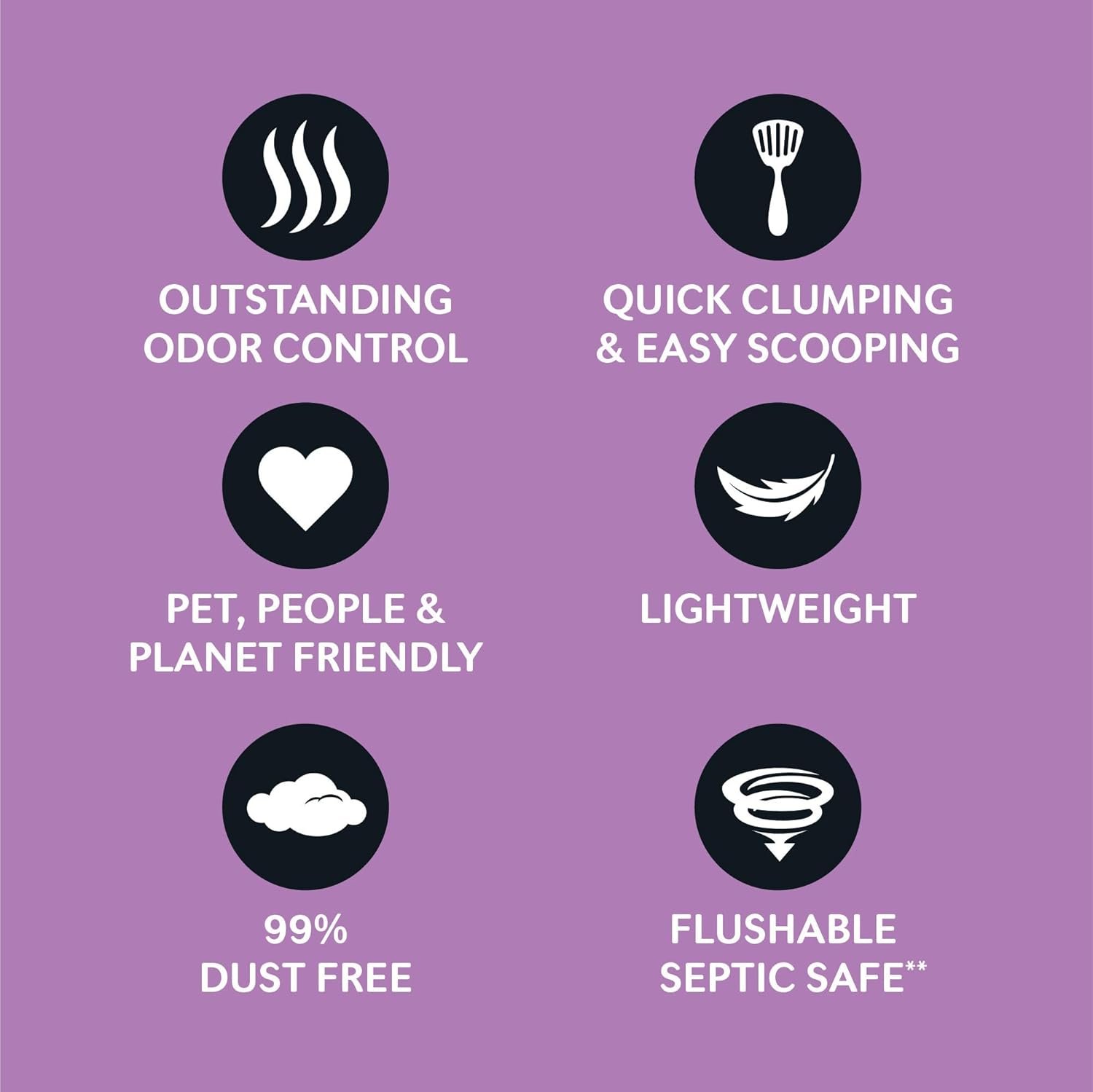 The World’s Best Cat Litter Multiple Cat Lavender Scented formula harnesses the power of naturally absorbent corn with natural lavender oil for cat owners who prefer their cat litter to be scented. Utilizing naturally absorbent corn, this formula delivers 2X longer lasting performance than the leading US litter brand. This naturally safe solution allows cat lovers like you to smell less, clean less and buy less. Naturally absorbent corn litter Scented with natural lavender oil Quick Clumping Outstanding Odor Control 99% Dust Free Flushable Septic Safe Delivers 2X longer lasting performance than the leading US litter brand Naturally safe solution Smell less, clean less and buy less.